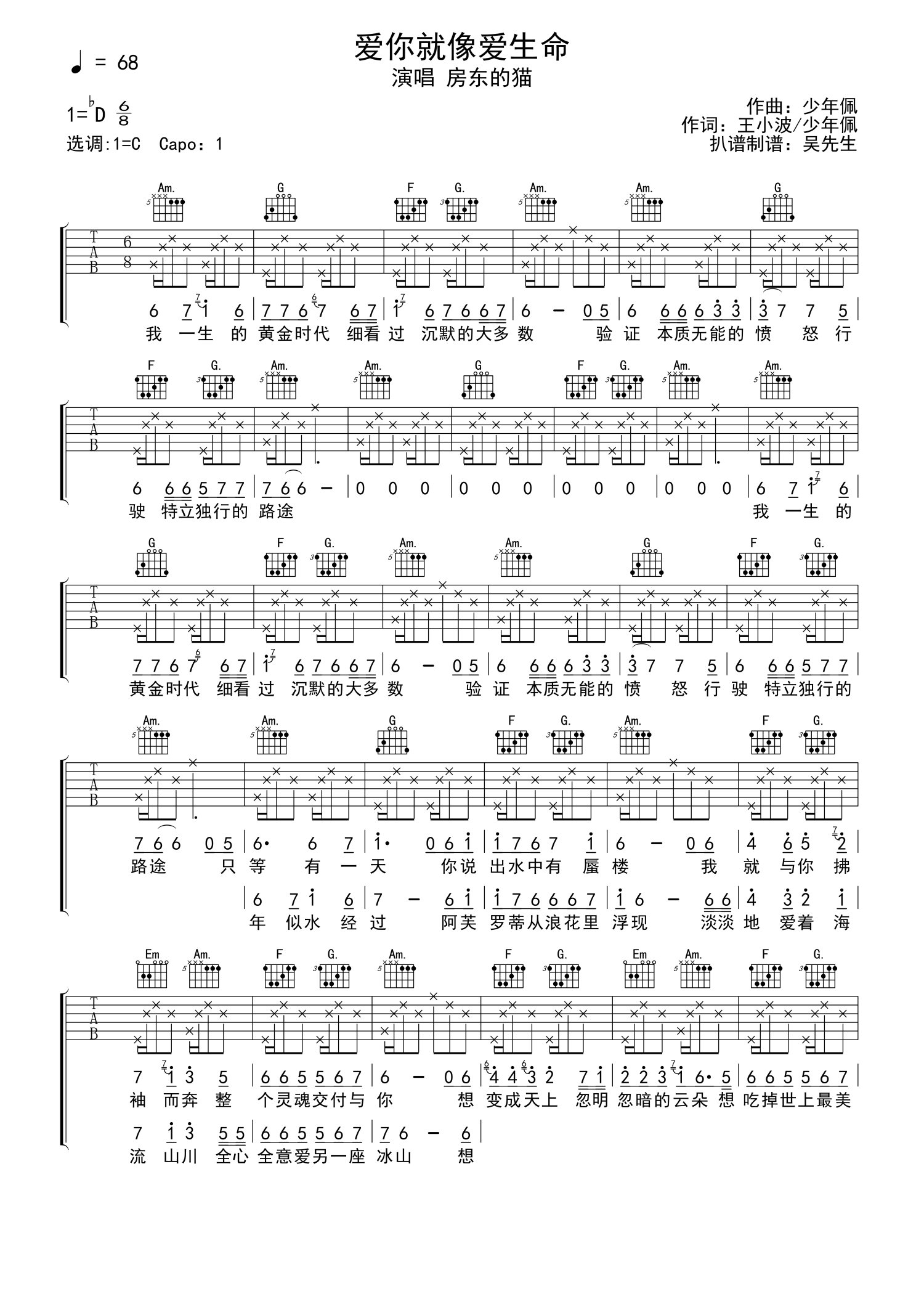 • 爱你就像爱生命吉他谱 - 房东的猫 - C调吉他弹唱谱第1张