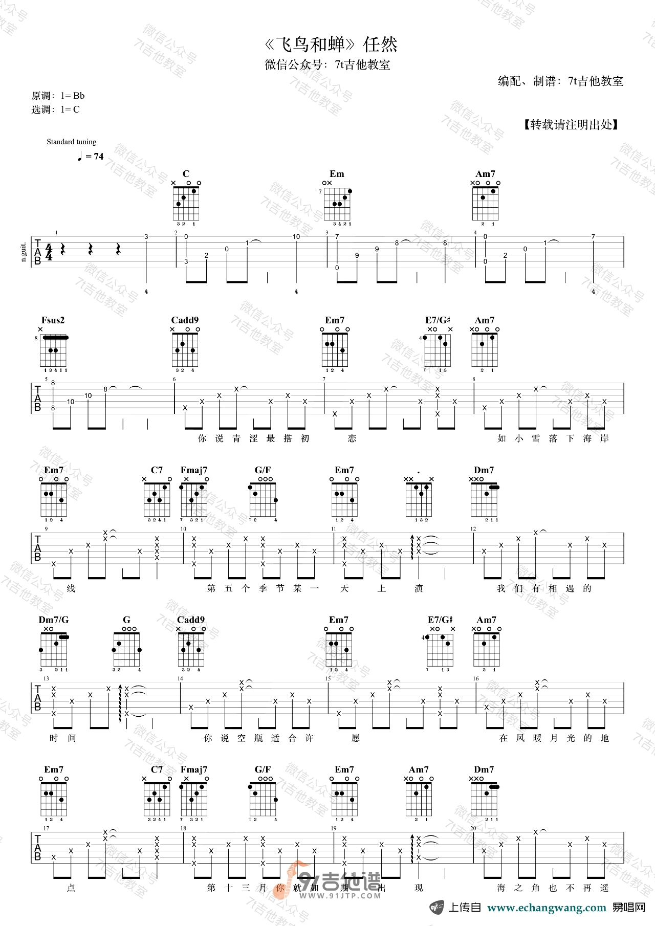 曲谱介绍: 曲谱简介:飞鸟和蝉吉他谱,任然演唱的一首歌曲,4/4拍的节奏,这首歌曲的原调为降B调,这里曲谱采用了C调指法进行编配,演唱时降全音调弦可回到原调,也可根据个人实际嗓音情况选择不降音或夹几品。曲谱由7T吉他教室编配出品。刚看到歌曲的曲名时,并不知道作词人想要表达的是怎样的情感。当看了歌词后,才发现原来曲名隐喻的是两个不同世界的人注定告别,毕竟飞鸟一心想要翱翔两天,而蝉则选择了栖息。
