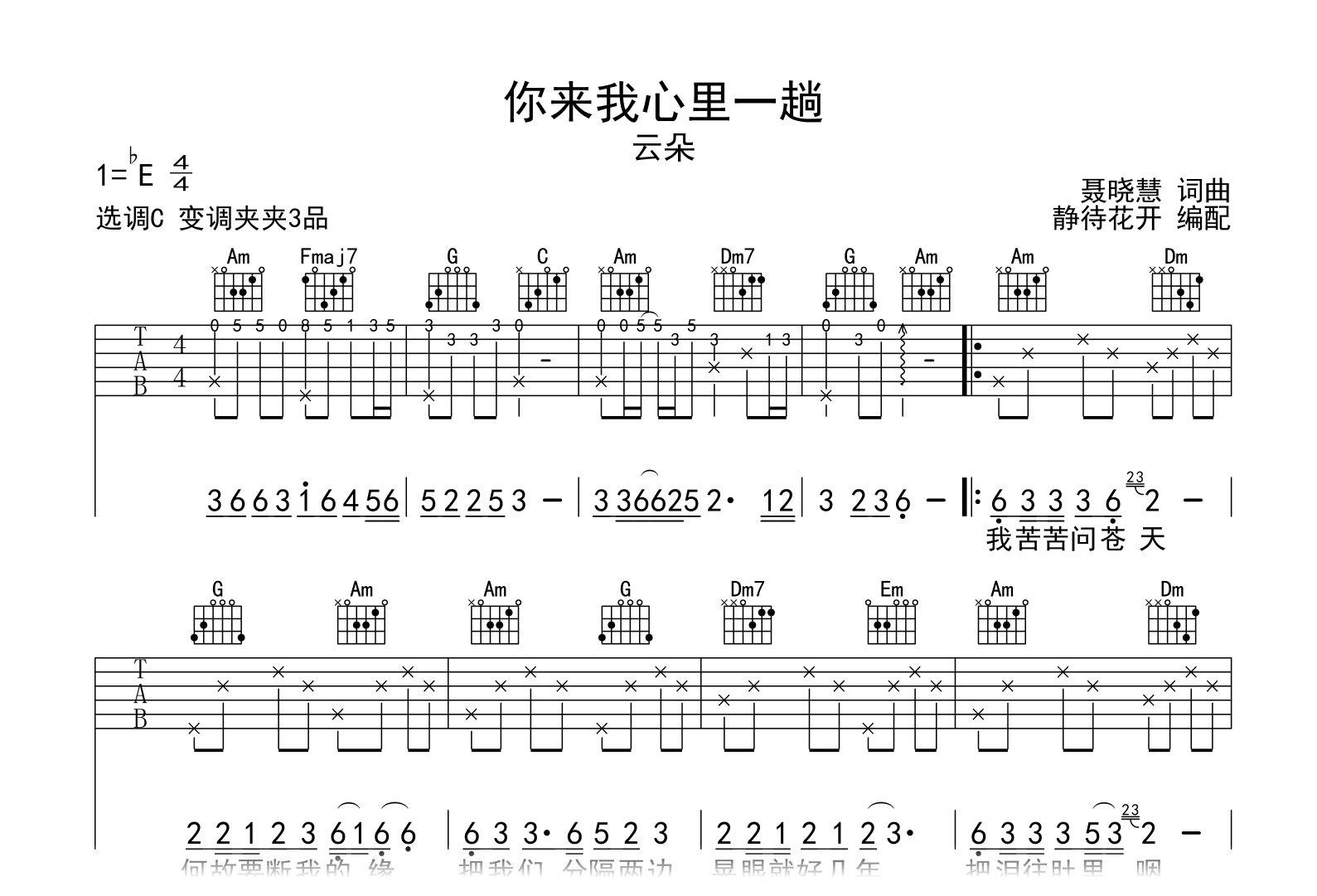 曲谱介绍: 你来我心里一趟吉他谱,云朵演唱,《你来我心里一趟》吉他弹唱谱,原调bE,采用C调和弦指法编配,建议变调夹夹3品,也可根据个人嗓音灵活选择变调夹位置,速度控制在每分钟80拍左右,演奏难度简单。 凄美的词句阐述对爱人的思念之情,悠扬的旋律总会把人带进那一片用生命守护的胡杨林和那段平凡又感人的爱情故事。