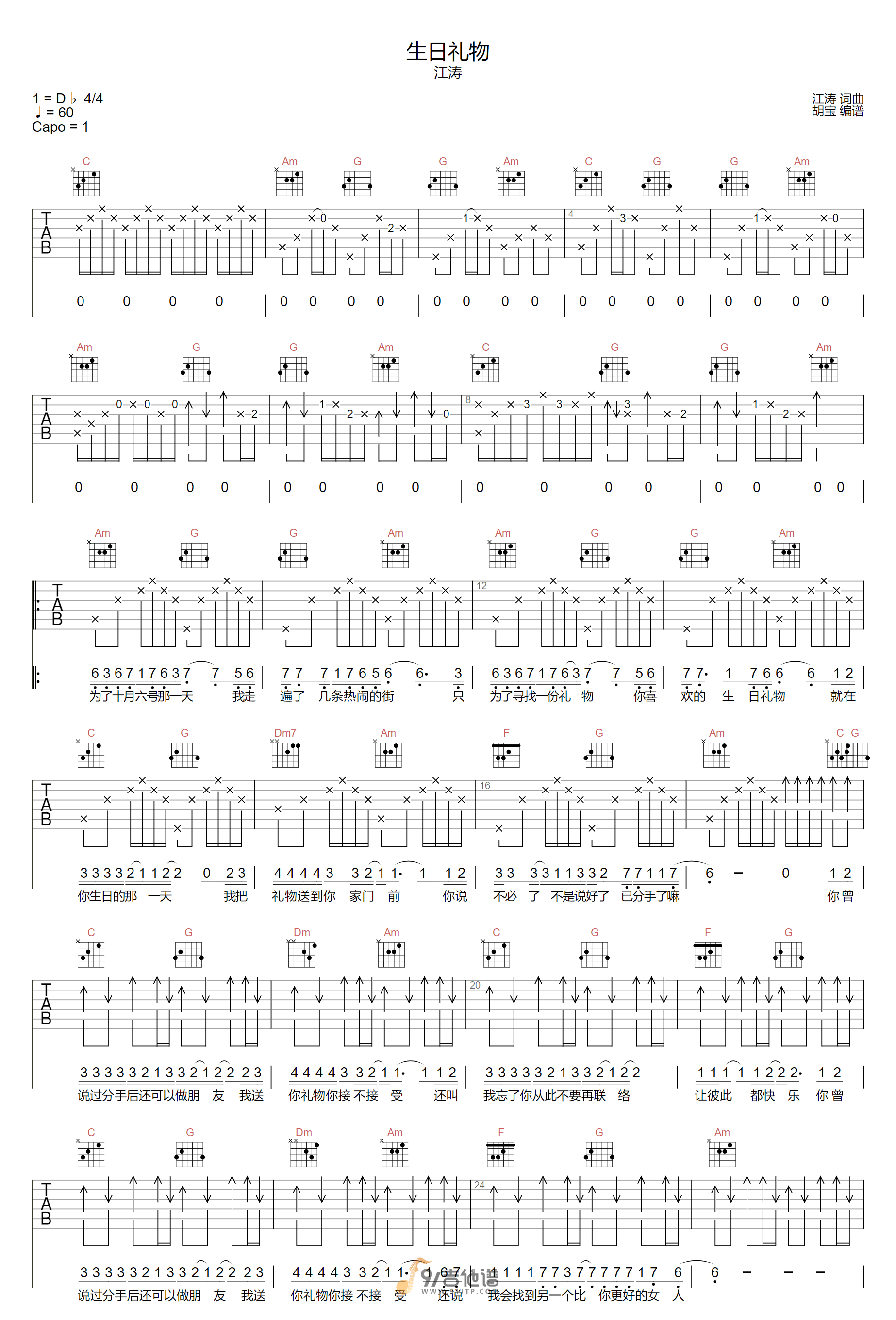 曲谱介绍: 曲谱简介:生日礼物吉他谱,半吨兄弟演唱的一首歌曲,4/4拍的节奏,这首歌曲的原调为降D调,这里曲谱采用了C调指法进行编配,演唱时夹变调夹1品可回到原调,也可根据个人实际嗓音情况选择。曲谱由胡宝编配出品。这首歌具备着相当的流行性与时尚感,从这张专辑推出后它的受欢迎程度来看,也已经证明了这一点。而半吨兄弟翻唱的烟嗓版,也别有一番风味。