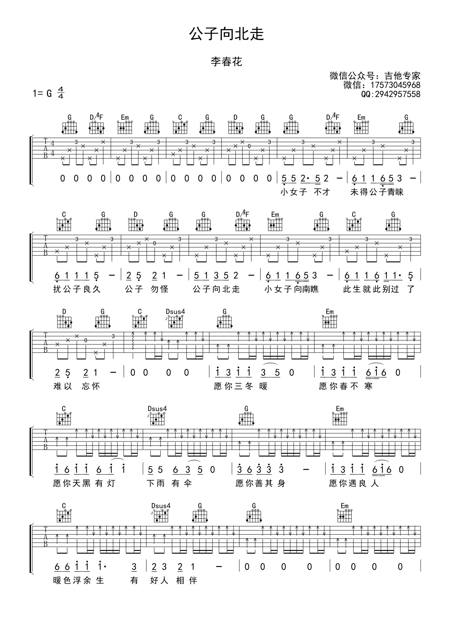 曲谱介绍: 李春花《公子向北走》吉他谱_G调吉他弹唱谱