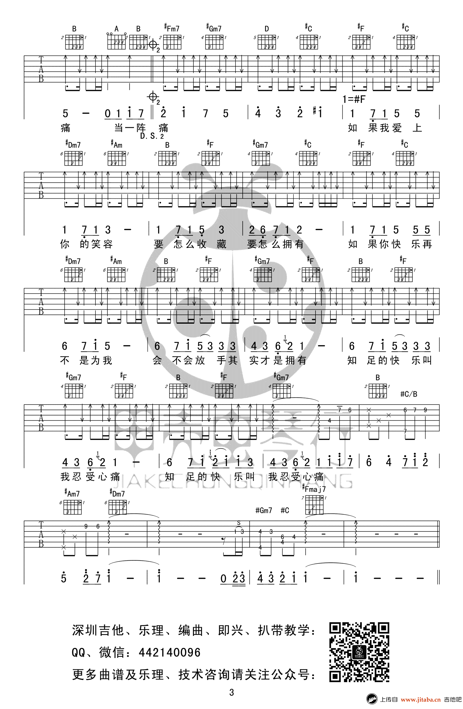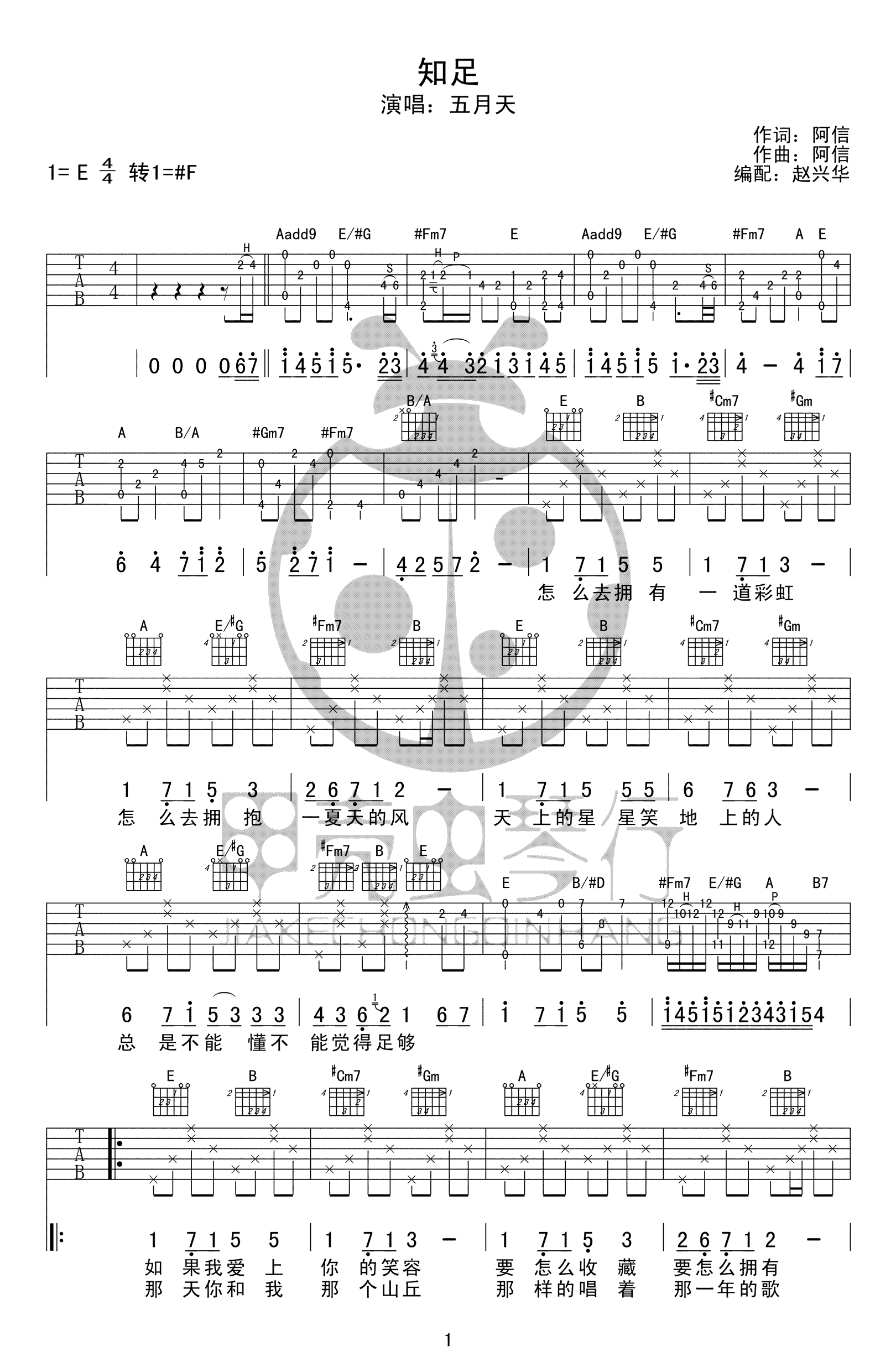 曲谱介绍: 知足吉他谱,五月天的一首经典代表作品,E调转#F调,知足六线谱,原版高清弹唱谱,三张图片谱例。感谢赵兴华编配,91吉他谱网站推荐上传。历尽风雨曲折,生活饱经时间岁月的冲刷,到现在已然没有了年少时的浮躁和焦虑,没有了那些不明所以的对浮华虚荣的追求,最终留下的才是最最可贵最最本质的生活。 生活里纵然会失去很多美好的东西,但我相信,现在所有的一切,都是最好的安排。
