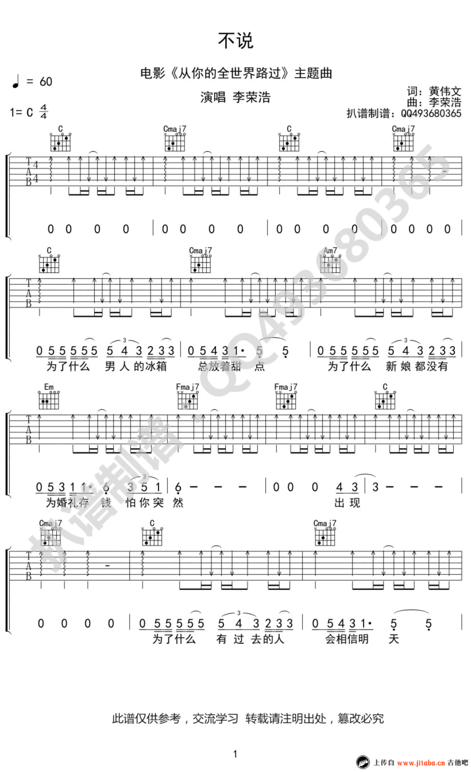 曲谱介绍: 李荣浩《不说》吉他谱_和弦弹唱谱不说吉他弹唱谱,李荣浩新歌《不说》吉他谱,电影《路过》主题曲。我们每个人只有品尝过爱的孤单和伤痛,才能成长为更好的自己。曾经每一个路过的人,都在帮助彼此,将人生的苦难修成正果,那些不说出口的话,其实才是最深情。
