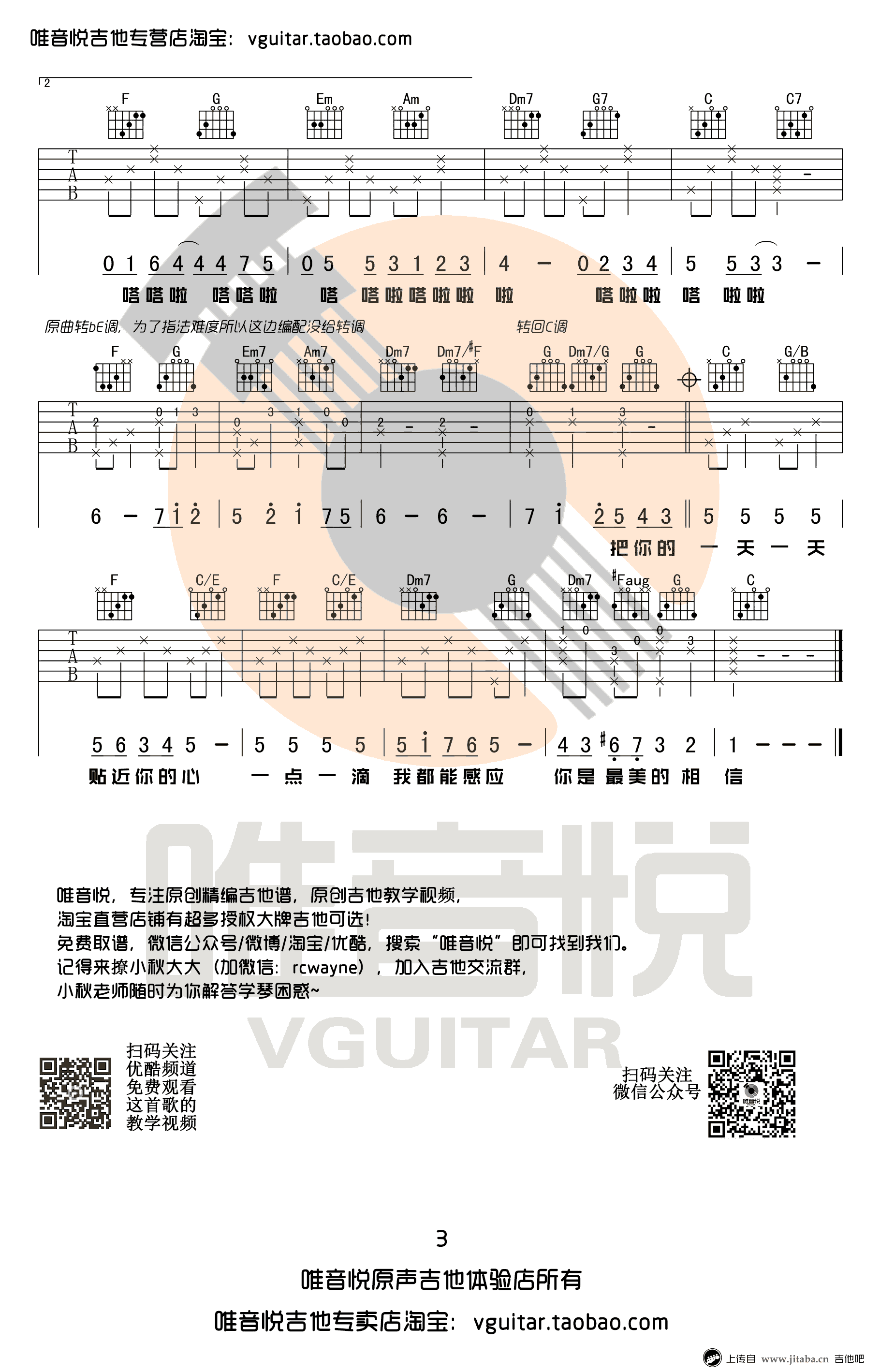 曲谱介绍: 心愿便利贴吉他谱,台湾电视剧《命中注定我爱你》的片尾曲,吴忠明元若蓝演唱,《心愿便利贴》六线谱,原版C调简单吉他谱,三张吉他弹唱图片谱,感谢唯音悦出品,91吉他谱网站收藏推荐。 大家只要把走向给记住了,整首歌其实谱子也就记住啦。总共也就分成3段,主歌:C->G/B/->Am->Am/G->F->C/E->Dm7->G;C->G/B/->F->C/E->Dm7->G->C。过渡:F->G->Em->Am->Dm7->Dm7/#F->G。副歌:C->G/B->F->C/E->F->C/E->Dm7->G;C->G/B->E->Am7->Dm7->Dm7/#F->G