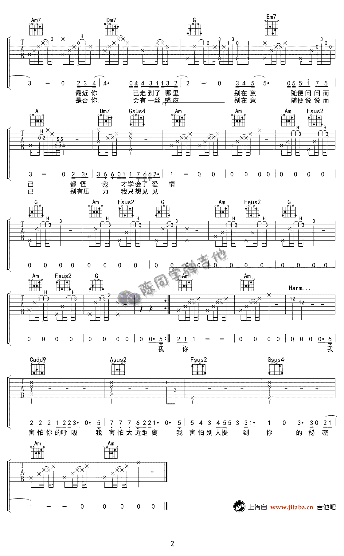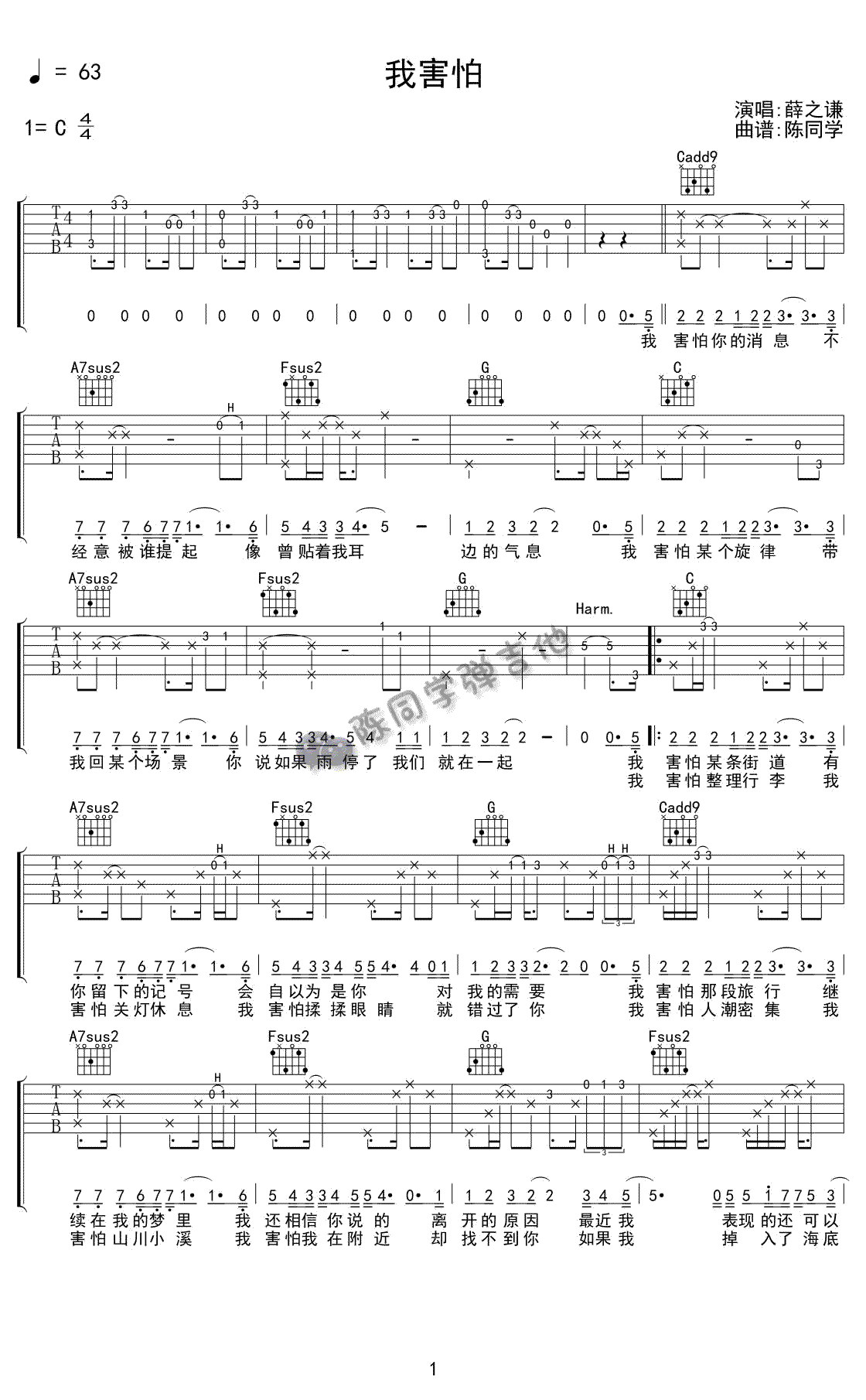 曲谱介绍: 我害怕吉他谱,C调指法,薛之谦演唱《我害怕》六线谱,高清弹唱谱两张图片谱例。曲谱由陈同学编配,91吉他谱网站上传推荐。整首歌以吉他为主奏乐器,不同于以往的“大歌”,这首歌表现的简单而纯粹。陈老师在扒这首歌的时候是一个音都不放过,只为了能最大的还原原曲的吉他弹奏。弹奏的难点主要是在于节奏方面,有很多的留白,所以一定要熟悉这首歌伴奏的节奏感。