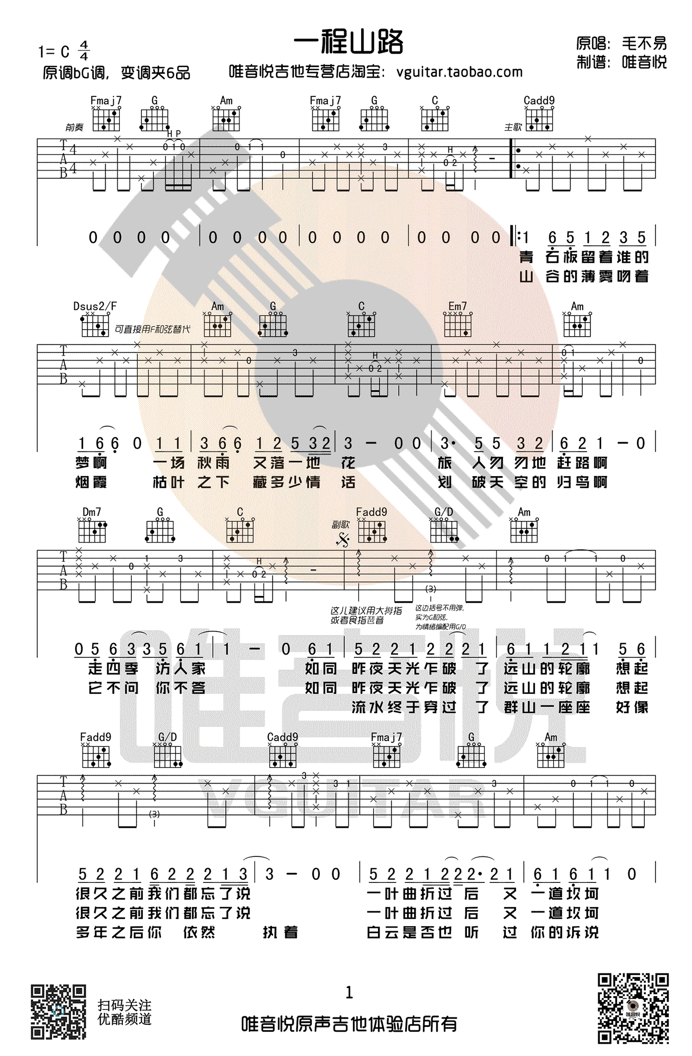 曲谱介绍: 毛不易《一程山路》六线谱,C调弹唱谱,CAPO6品。一程山路吉他谱,高清图片谱,唯音悦编配,91吉他谱上传。 一首很耐听的古风原创歌曲,行云流水,匆匆过客,古典的旋律响起,一幅充满诗情的画卷缓缓舒展开来。歌声里,有当年忘了说,如今仍执着的遗憾,又有铅华褪尽的释怀。生活如同爬山,翻山越岭一路风尘的艰辛,跋山涉水到达目的地之后的喜悦,都是必经的心理路程。