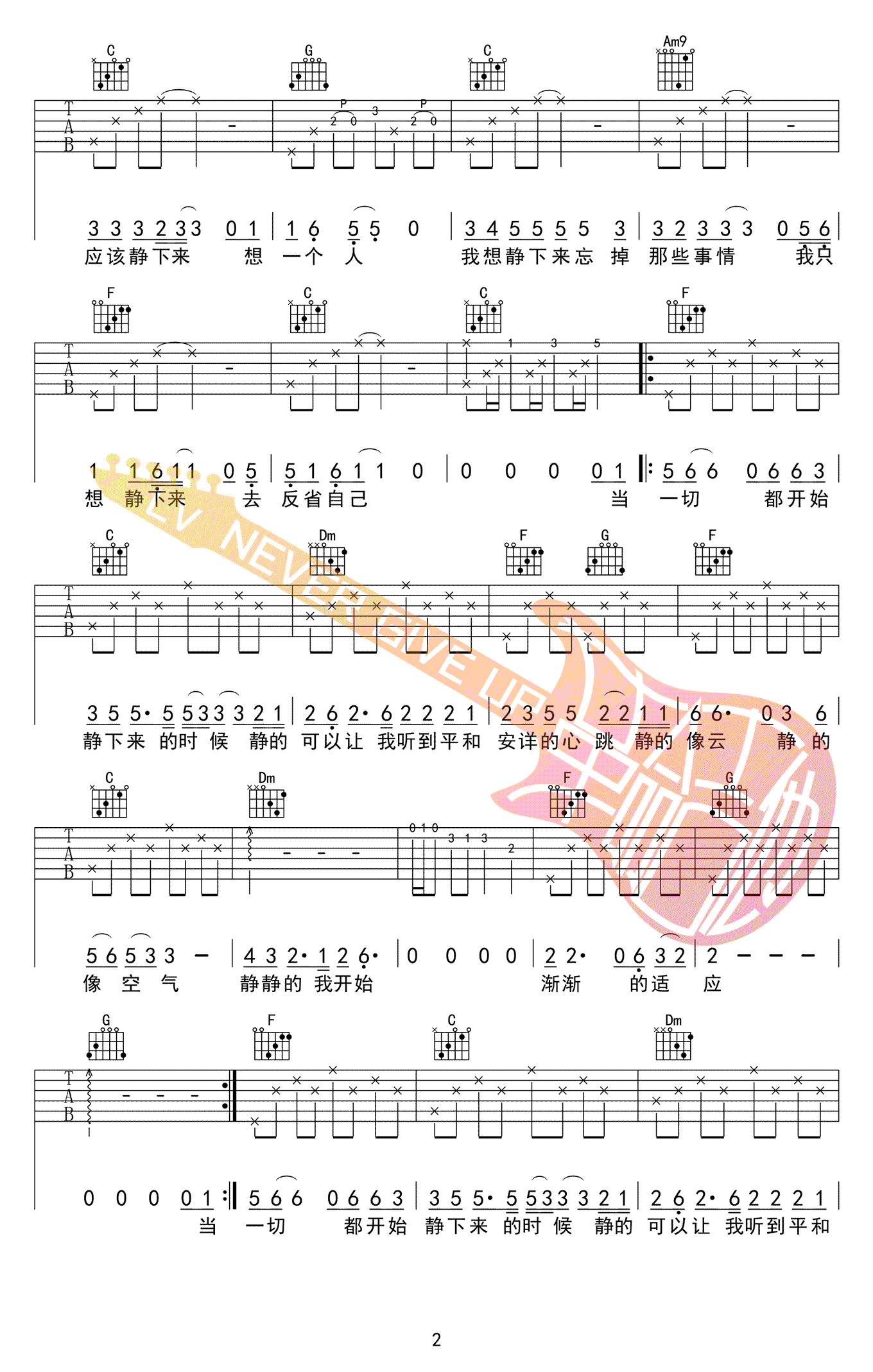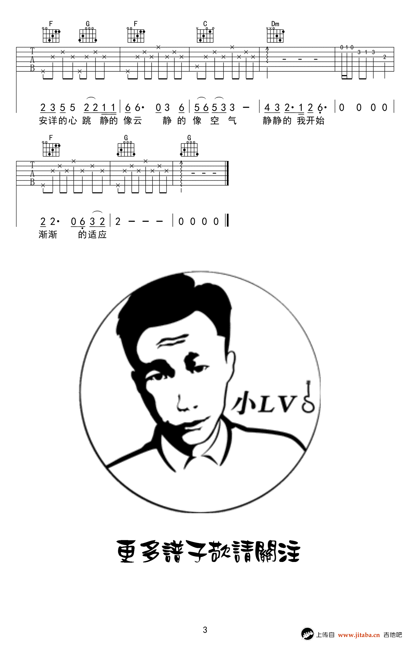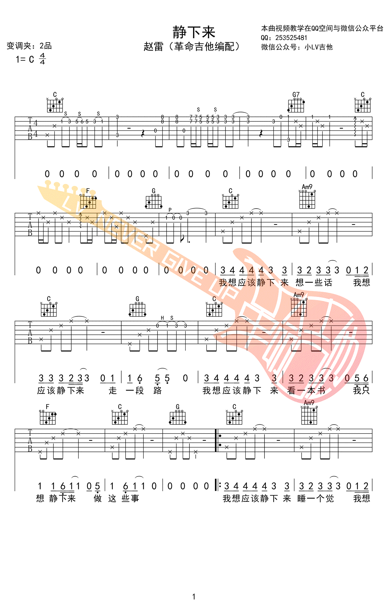 曲谱介绍: 赵雷《静下来》吉他谱,C调指法,变调夹夹二品。静下来六线谱,三张图片谱高清版。革命吉他编配,琴友们可以参照小V老师细致的讲解教学视频学习,91吉他谱网站整理上传推荐。歌曲原唱大乔小乔,赵雷将这一首旧作《静下来》重制发表,像是对于在爆红之后守住初心的无声宣言。
