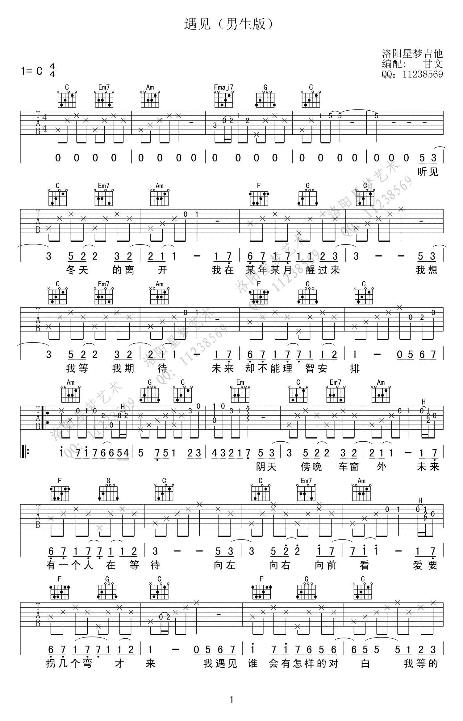 曲谱介绍: 遇见吉他谱,C调指法男生版,孙燕姿演唱的一首经典歌曲,《向左走向右走》电影主题曲,遇见吉他弹唱谱,高清图片六线谱。感谢甘文编配,91吉他谱网站推荐分享。