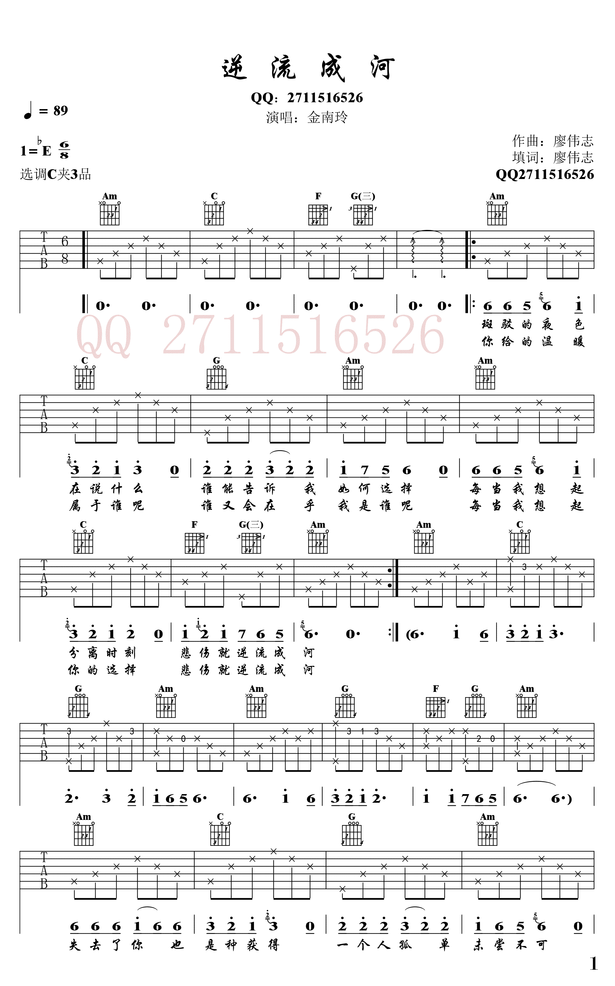 曲谱介绍: 金南玲《逆流成河》吉他谱,C调指法编配,变调夹夹三品。逆流成河六线谱,高清弹唱图片谱。91吉他谱网站整理上传。 一首让人单曲循环的网络红歌,诉说多少人对爱情的心酸与无奈,以及对爱情抉择的困惑,和着旋律,唱出心里的逆流成河的伤感。