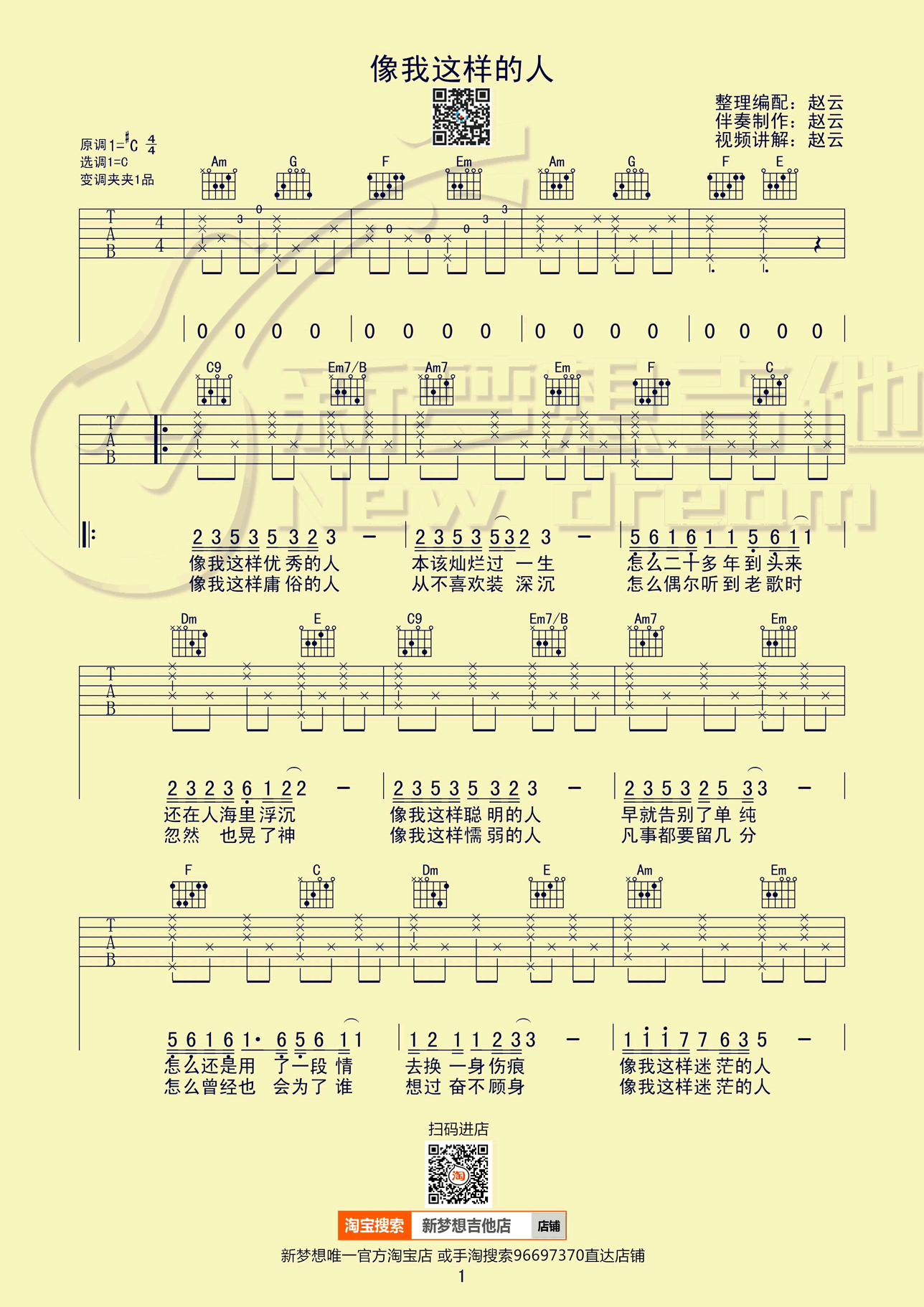 曲谱介绍: 像我这样的人吉他谱,原调#C,选调C,变调夹夹一品。毛不易的一首非常受欢迎的热门歌曲,唱尽了现实社会平凡人物的心酸和曲折。像我这样的人六线谱,新梦想吉他出品,91吉他谱网站为琴友们上传推荐。随谱附上赵云老师为大家带来的配套弹唱教学视频。