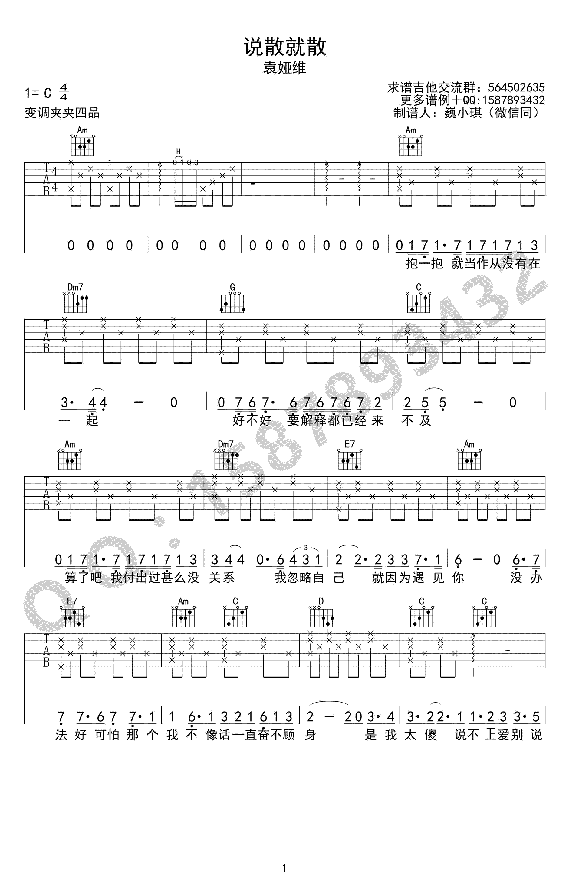 曲谱介绍: 袁娅维演唱《说散就散》吉他谱,C调简单版,变调夹夹四品。热门电影《前任3》主题曲,唱出多少分手男女的伤痛,袁娅维的版放慢了歌的整体节奏也很好听。说散就散吉他弹唱谱,高清图片六线谱,完整版共四张谱例。感谢巍小琪制谱,91吉他谱网站上传收藏。