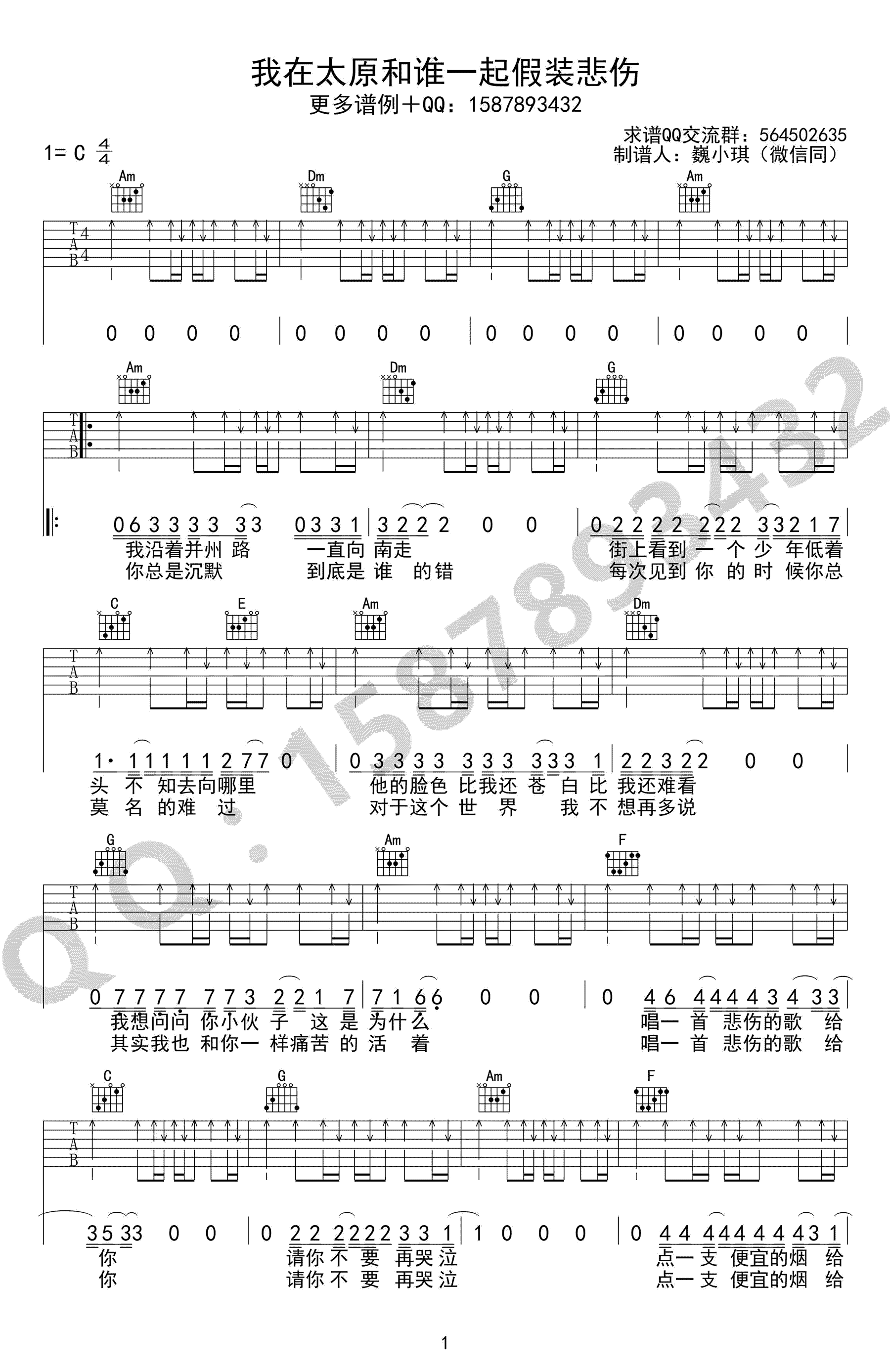 曲谱介绍: 《我在太原和谁一起假装悲伤》吉他谱,贰佰的首个民谣创作,C调简单版弹唱谱,我在太原和谁一起假装悲伤六线谱,高清图片谱,感谢巍小琪制谱,91吉他谱上传。