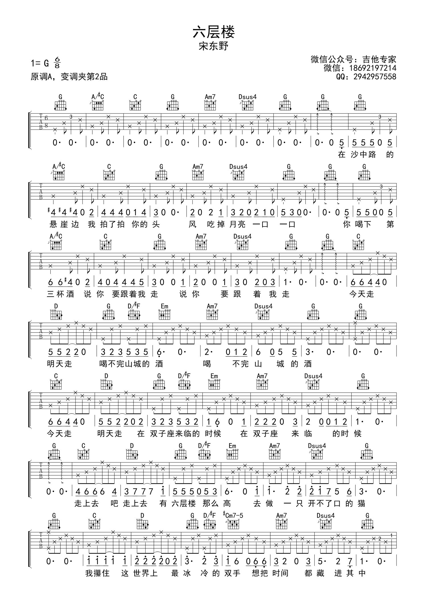 曲谱介绍: 宋冬野《六层楼》吉他谱_G调吉他弹唱谱