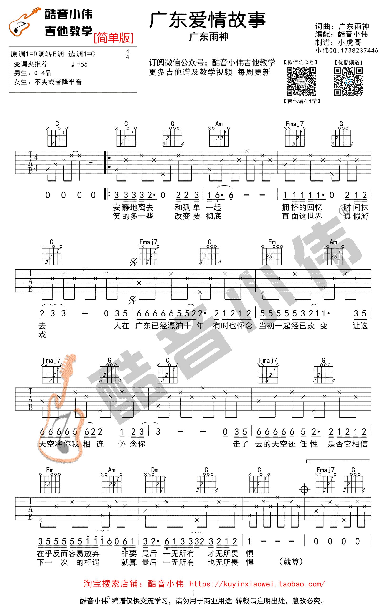 曲谱介绍: 广东雨神《广东爱情故事》吉他谱,C调简单版,原调D转E调,变调夹推荐,男生0-4品,女生不夹或降半音。广东爱情故事吉他弹唱谱,高清图片六线谱。感谢酷音小伟编配,91吉他谱网站上传分享。 一首《广东爱情故事》唱出了多少人背井离乡在外漂泊的心声,愿所有正在漂泊打拼的你,早日找到属于自己的爱情!