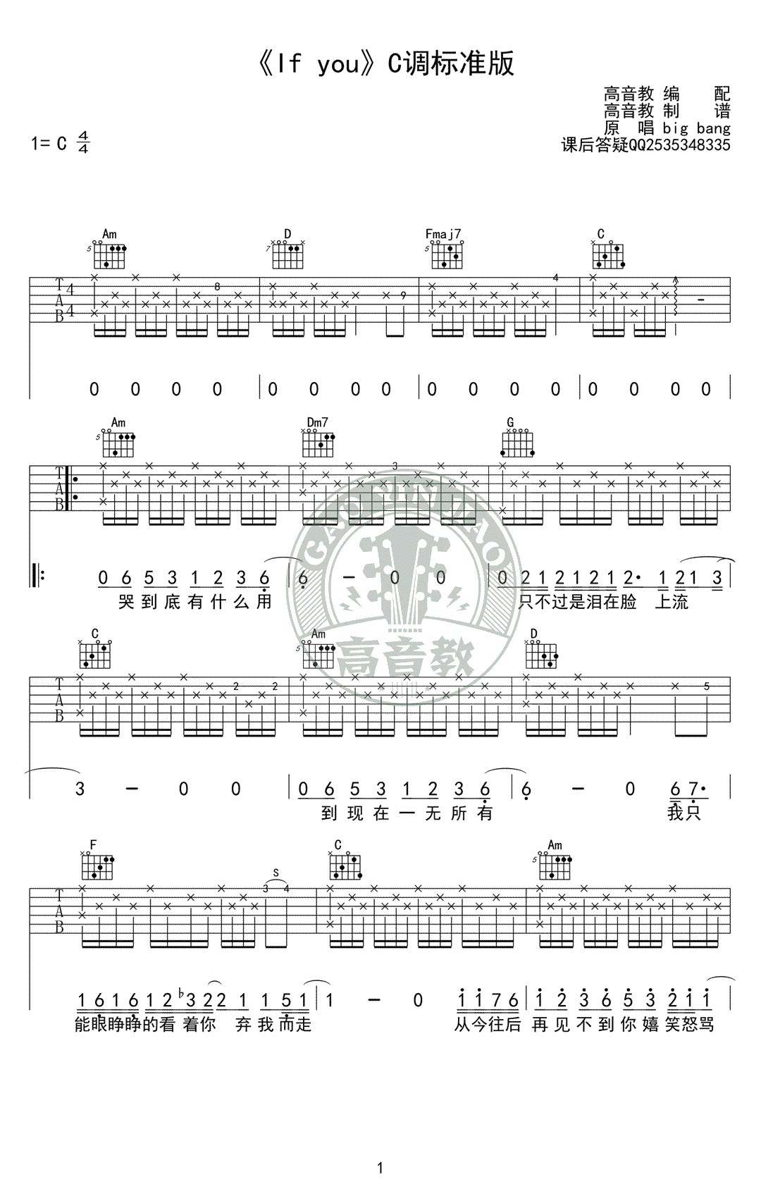 曲谱介绍: if you吉他谱,C调标准版,Ibigbang《if you》吉他弹唱谱,中文填词版,高清图片六线谱。感谢高音教编配制谱,91吉他谱上传分享。 被众多歌手和音乐达人翻唱的一首歌曲,忧伤的歌词、细腻的旋律,感性的演绎,这首歌成为单曲循环的经典。歌词直白,却一字一句能感受到真情流露。听歌怀人,希望这首歌声能传达给想念的那个人。