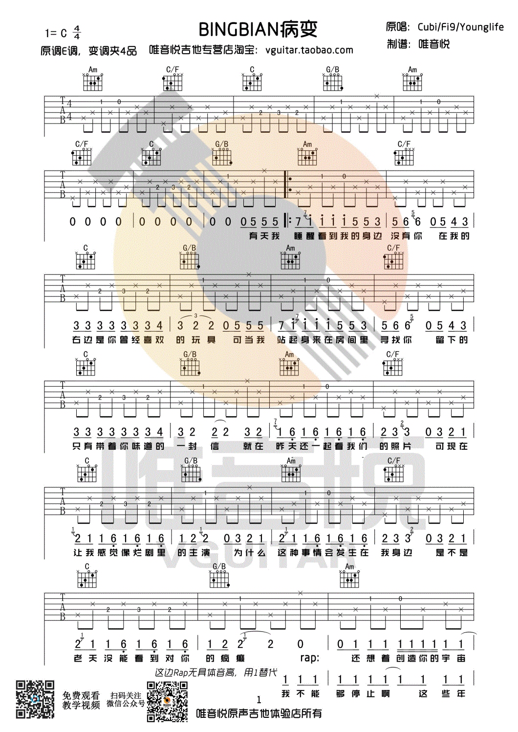 曲谱介绍: 病变吉他谱,原调E调,变调夹夹四品,选用C调指法编配,病变吉他六线谱,四张图片谱,唯音悦编配制谱,91吉他谱网站推荐上传。 一首洗脑的网络歌曲,伤感的歌词,动听的旋律,勾起了多少人对喜欢人的回忆。鞠文娴翻唱的《病变》非常的火,相比较男生版,女生版更加细腻好听。