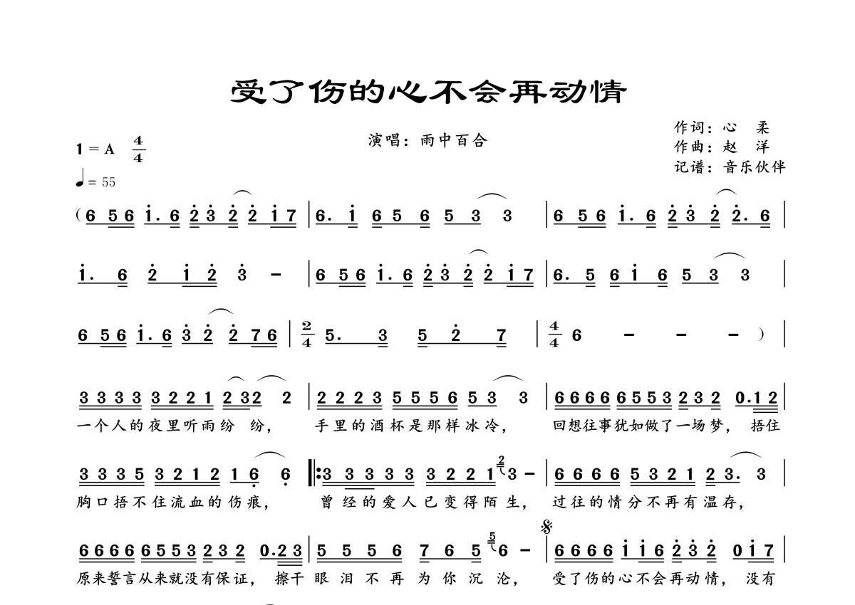 曲谱介绍: 雨中百合《受了伤的心不会再动情》,音乐伙伴编配出品,共有1张高清图谱,免翻页排版设计。