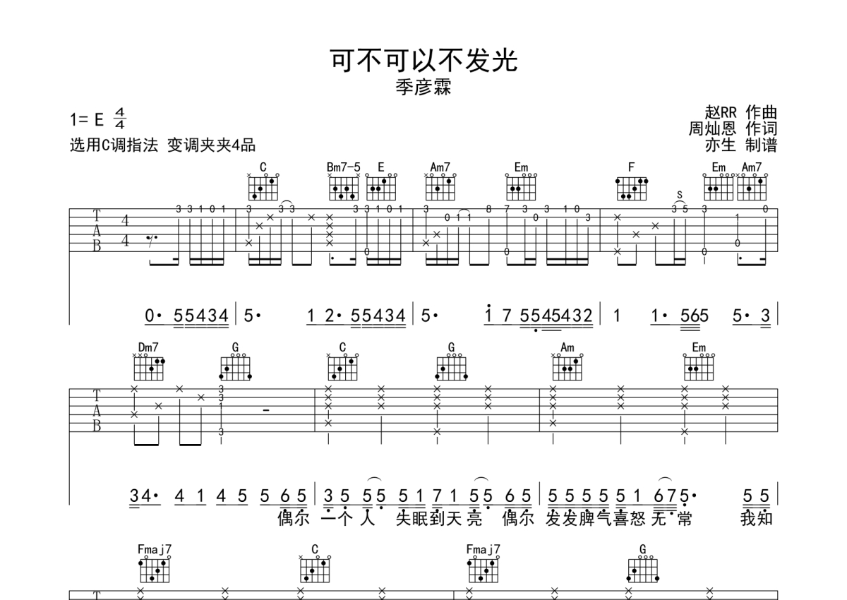 • 可不可以不发光吉他谱 - 季彦霖 - C调吉他弹唱谱第1张