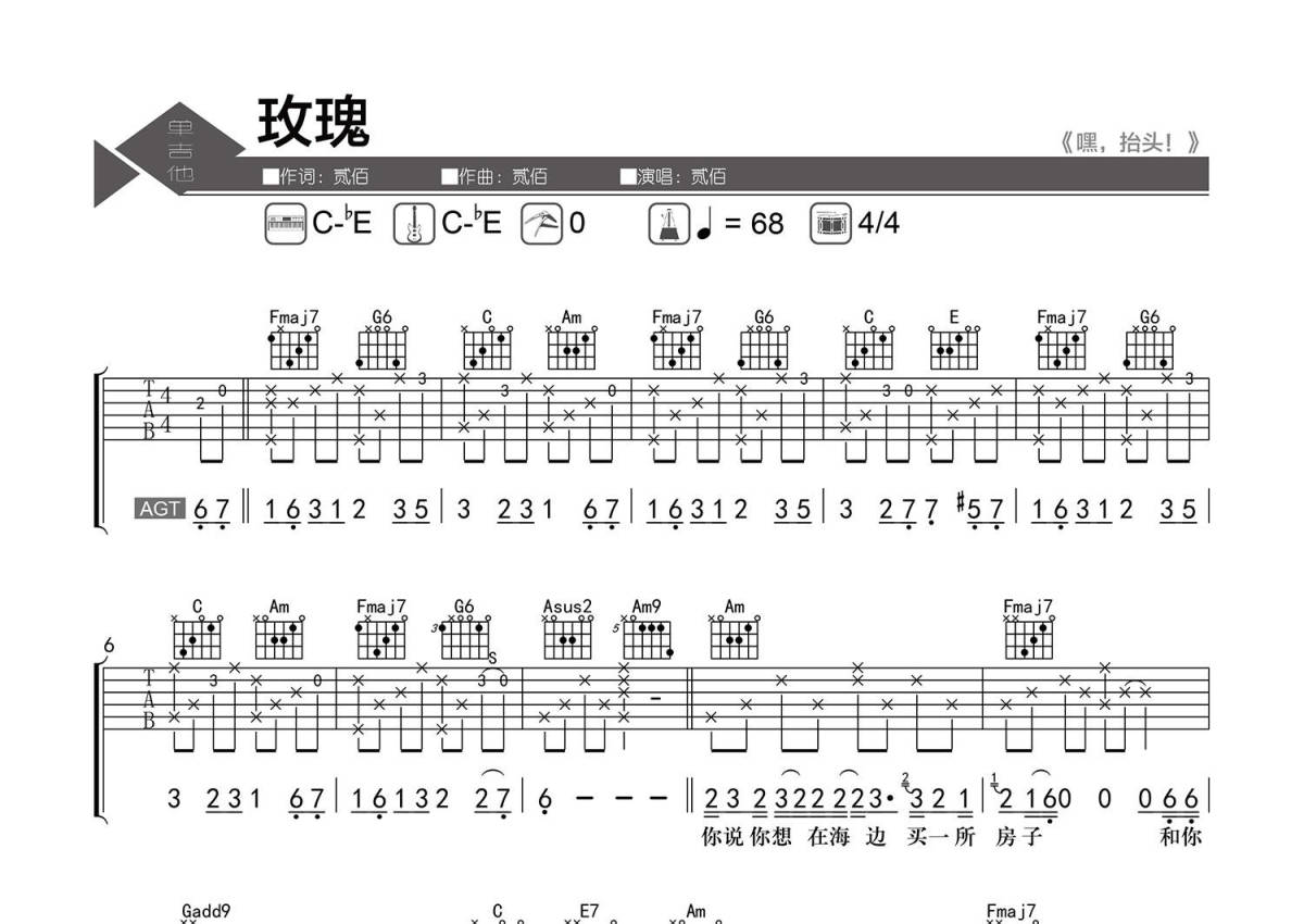 曲谱介绍: 贰佰《玫瑰》吉他弹唱谱,采用C调指法编配精编弹唱,老杨教吉他编配出品,共有3张高清图谱。