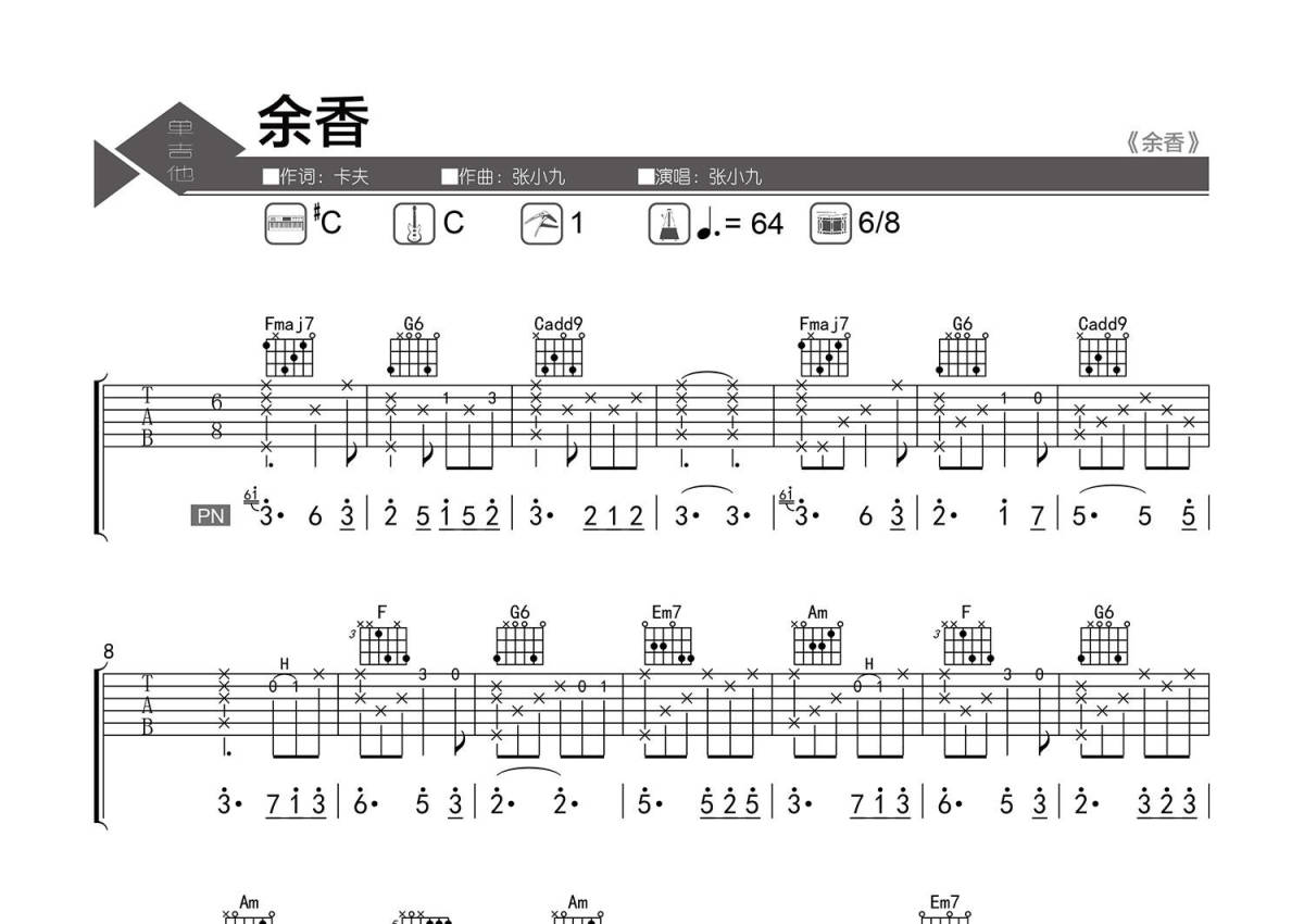 • 余香吉他谱 - 张小九 - C调吉他弹唱谱 - 精编弹唱第1张
