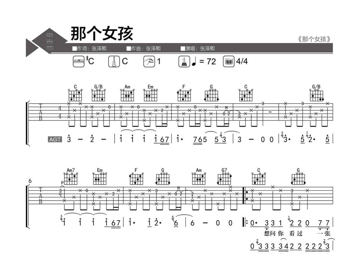 • 那个女孩吉他谱 - 张泽熙 - C调吉他弹唱谱 - 精编弹唱第1张