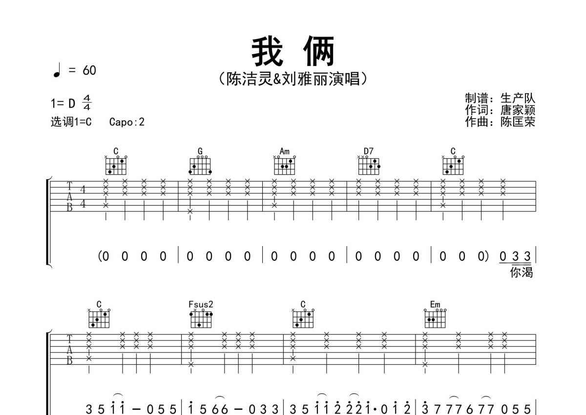 曲谱介绍: 陈洁灵/刘雅丽《我俩》吉他弹唱谱,采用C调指法编配精编完美版,生产队编配出品,共有3张高清图谱。