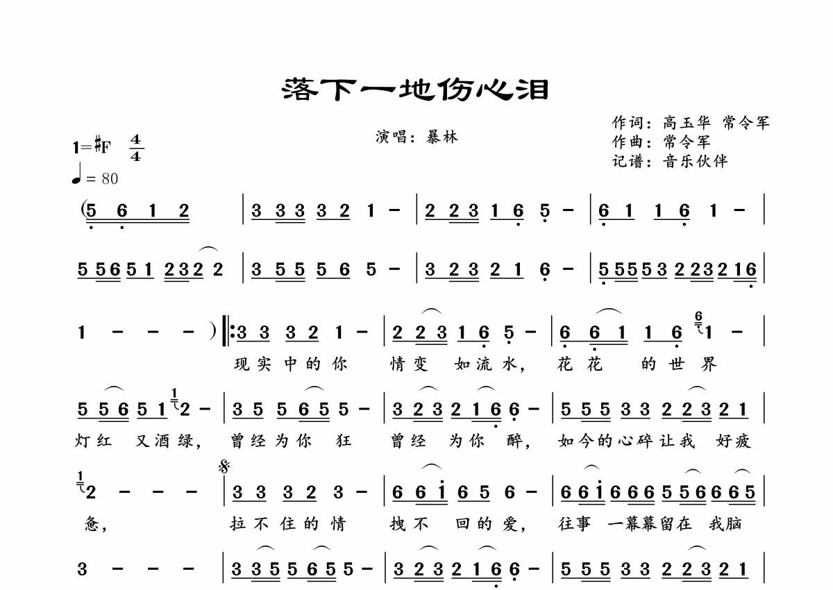 曲谱介绍: 暴林《落下一地伤心泪》,音乐伙伴编配出品,共有1张高清图谱,免翻页排版设计。