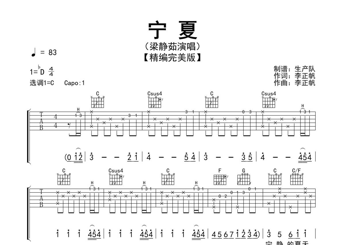 曲谱介绍: 梁静茹《宁夏》吉他弹唱谱,采用C调指法编配精编完美版,生产队编配出品,共有3张高清图谱。