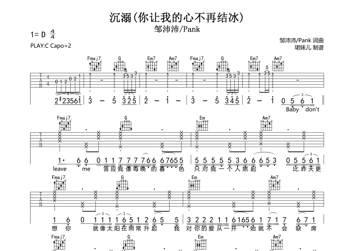 曲谱介绍: 邹沛沛/Pank《沉溺》吉他弹唱谱,采用C调指法编配,珺妹儿编配出品,共有2张高清图谱,免翻页排版设计。