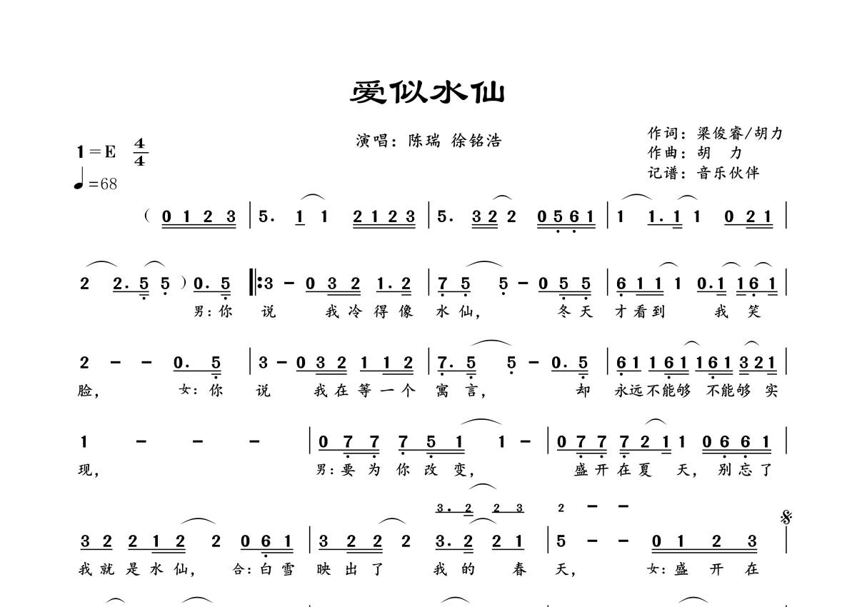 曲谱介绍: 陈瑞&徐铭浩《爱似水仙》,音乐伙伴编配出品,共有1张高清图谱,免翻页排版设计。