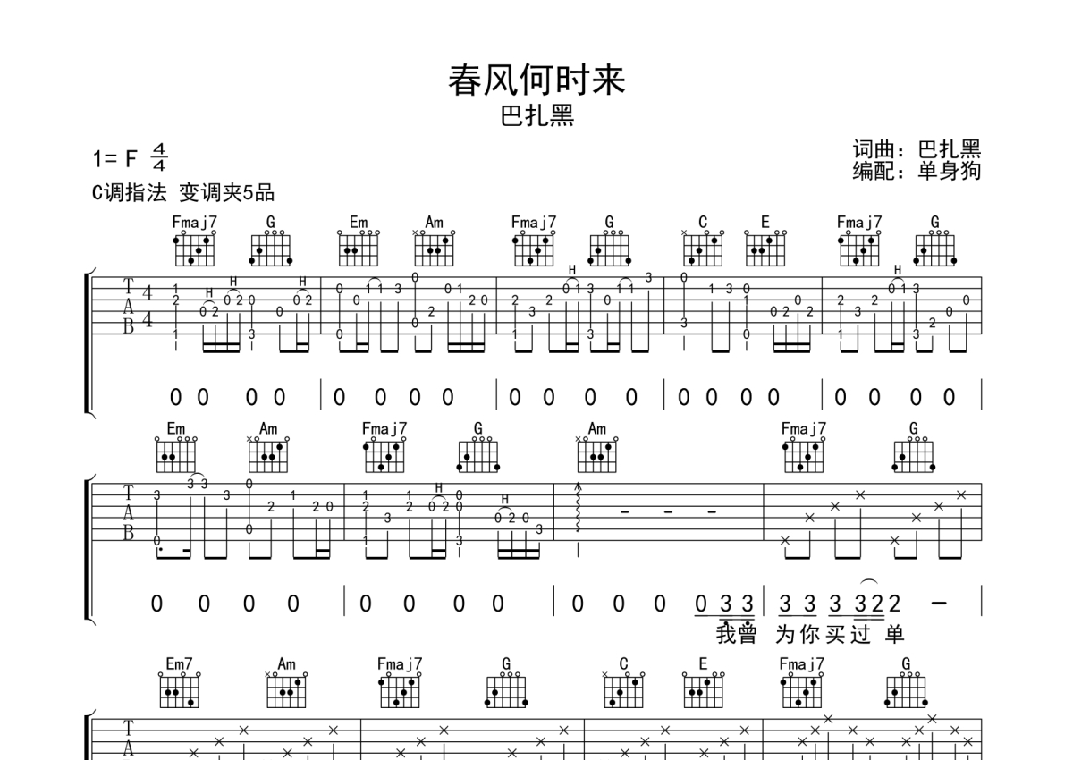 曲谱介绍: 巴扎黑《春风何时来》吉他弹唱谱,采用C调指法编配,单身狗编配出品,共有3张高清图谱。