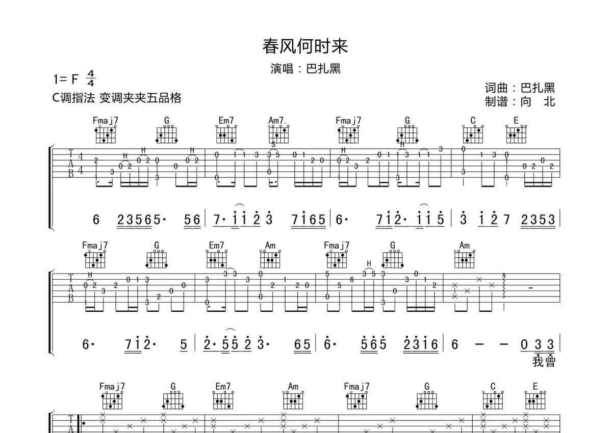 • 春风何时来吉他谱 - 巴扎黑 - C调吉他弹唱谱 - 专辑版第1张