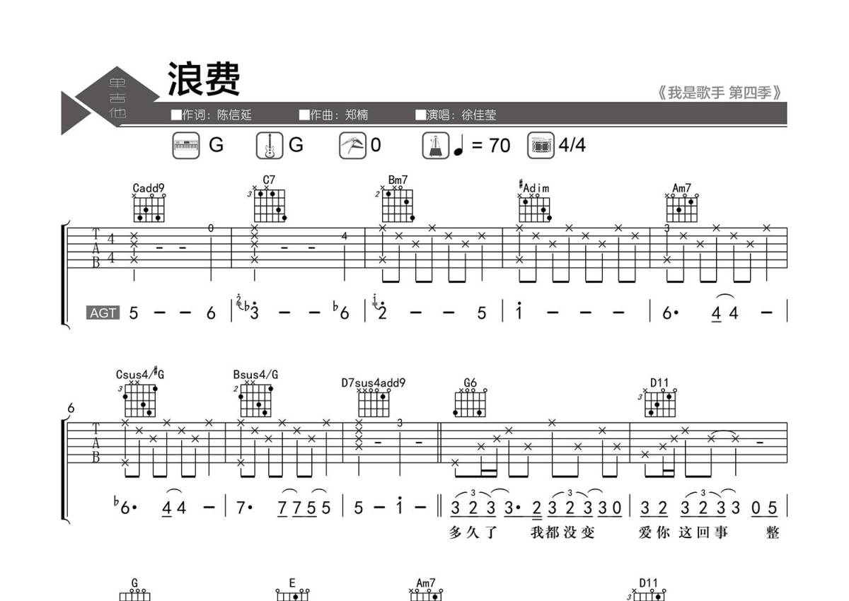 • 浪费吉他谱 - 徐佳莹 - G调吉他弹唱谱 - 精编弹唱第1张