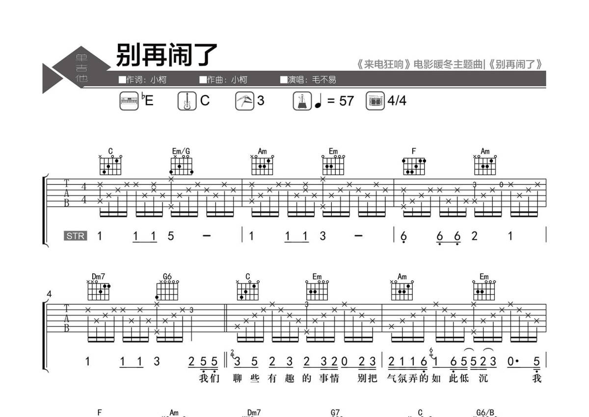 曲谱介绍: 毛不易《别再闹了》吉他弹唱谱,采用C调指法编配精编弹唱,老杨教吉他编配出品,共有3张高清图谱。