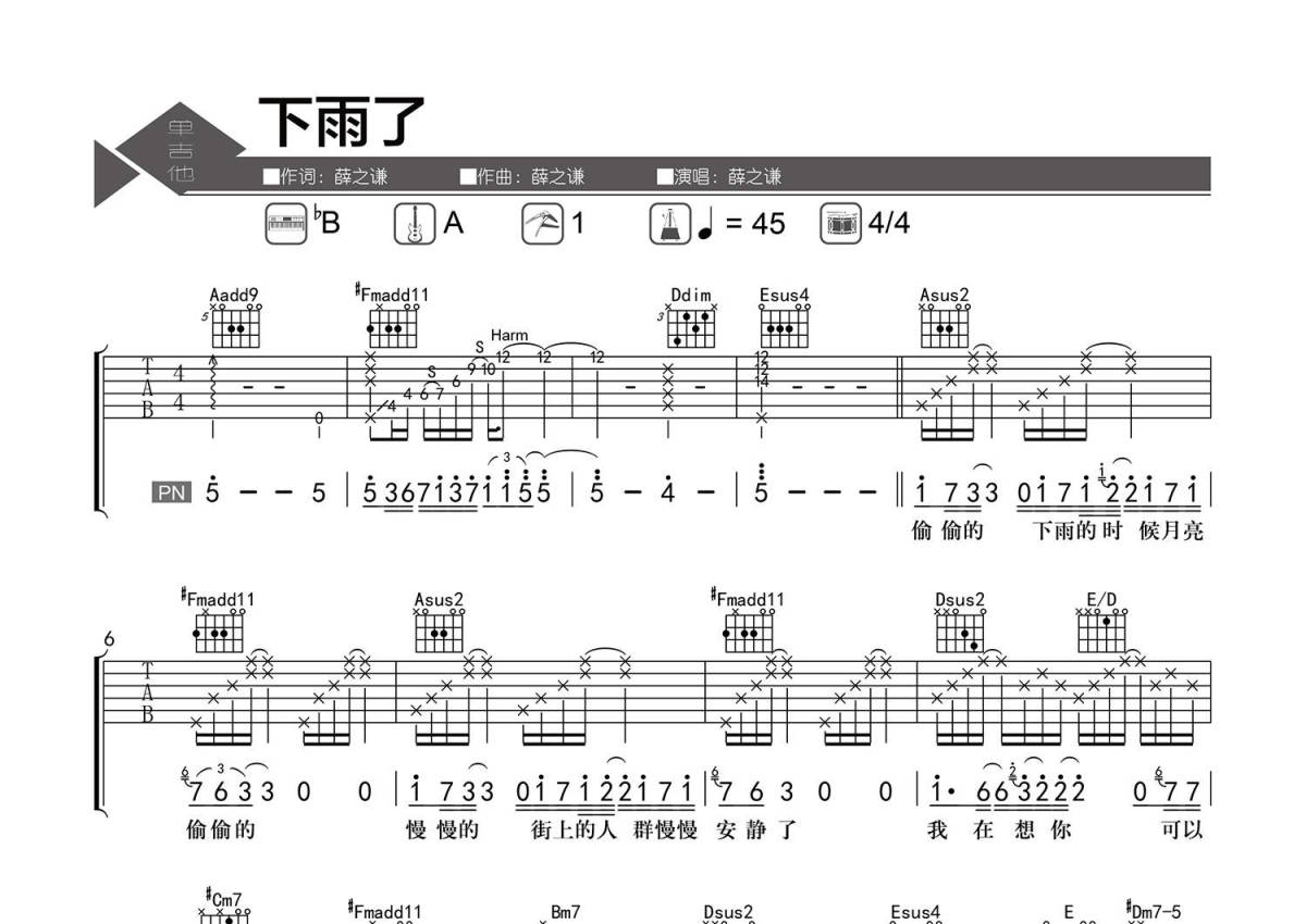 • 下雨了吉他谱 - 薛之谦 - A调吉他弹唱谱 - 精编弹唱第1张