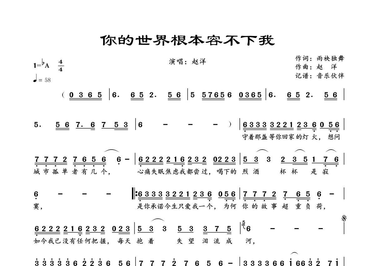 曲谱介绍: 赵洋《你的世界根本容不下我》,音乐伙伴编配出品,共有1张高清图谱,免翻页排版设计。