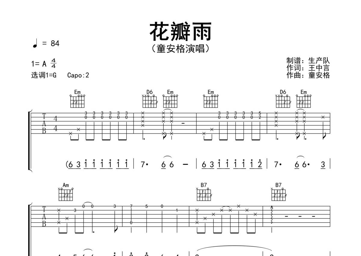曲谱介绍: 童安格《花瓣雨》吉他弹唱谱,采用G调指法编配精编民谣版,生产队编配出品,共有3张高清图谱。