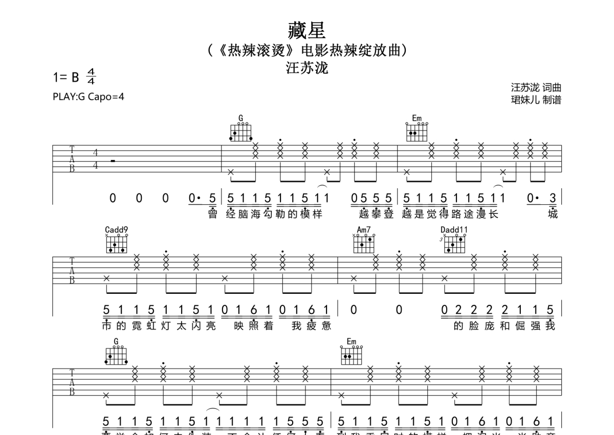 曲谱介绍: 汪苏泷《藏星》吉他弹唱谱,采用G调指法编配,珺妹儿编配出品,共有3张高清图谱。