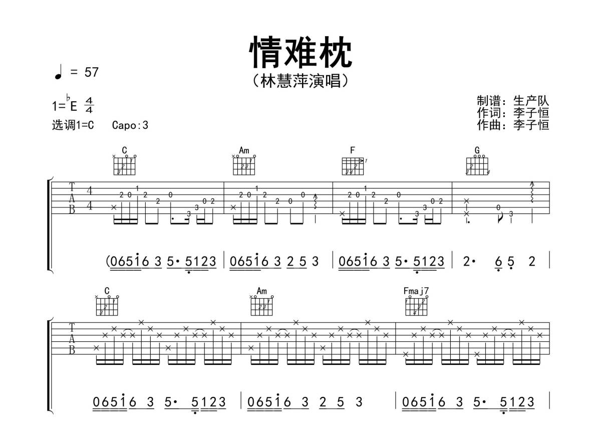 曲谱介绍: 林慧萍《情难枕》吉他弹唱谱,采用C调指法编配精编完美版,生产队编配出品,共有3张高清图谱。