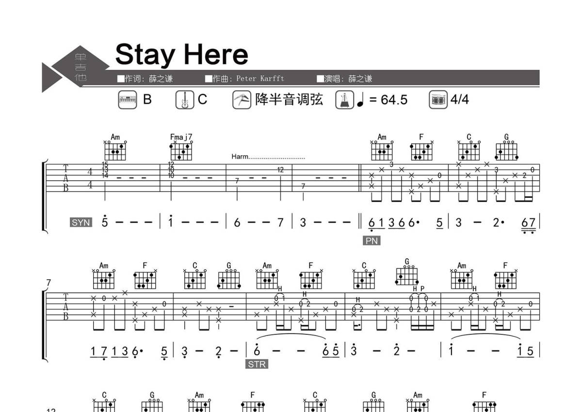 曲谱介绍: 薛之谦《StayHere》吉他弹唱谱,采用C调指法编配精编弹唱,老杨教吉他编配出品,共有4张高清图谱。