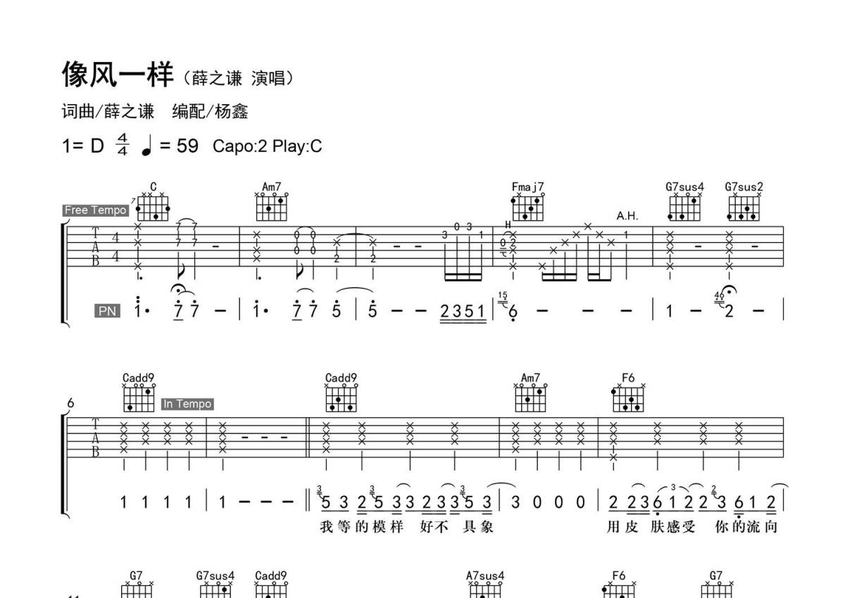 曲谱介绍: 薜之谦《像风一样》吉他弹唱谱,采用C调指法编配精编弹唱,老杨教吉他编配出品,共有3张高清图谱。