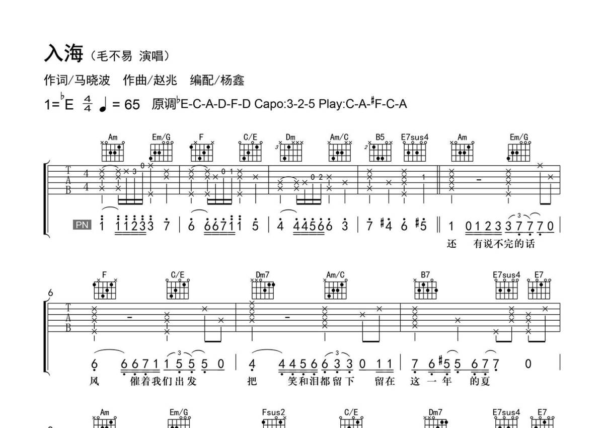 曲谱介绍: 毛不易《入海》吉他弹唱谱,采用C调指法编配精编弹唱,老杨教吉他编配出品,共有5张高清图谱。