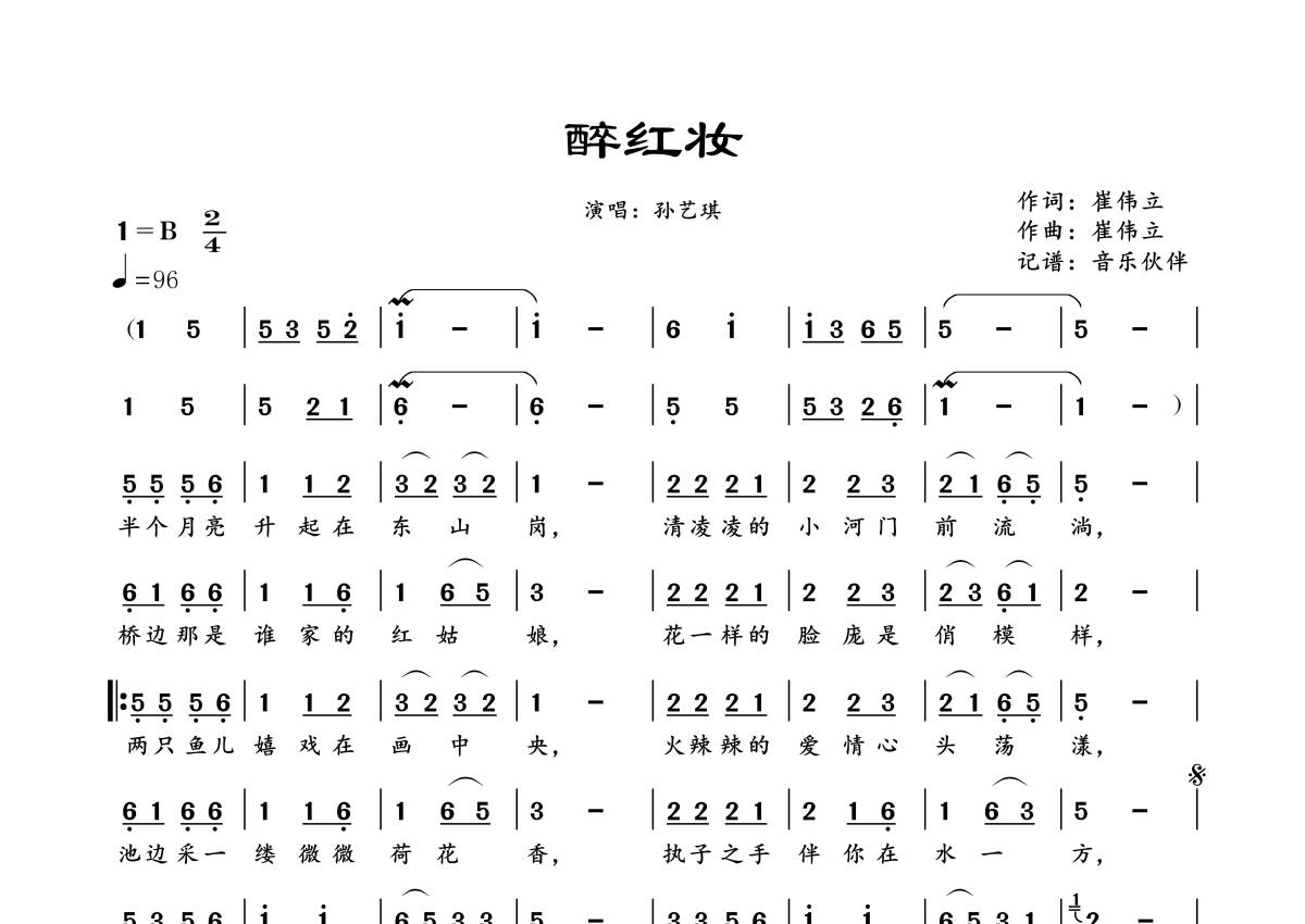 曲谱介绍: 孙艺琪《醉红妆》,音乐伙伴编配出品,共有1张高清图谱,免翻页排版设计。