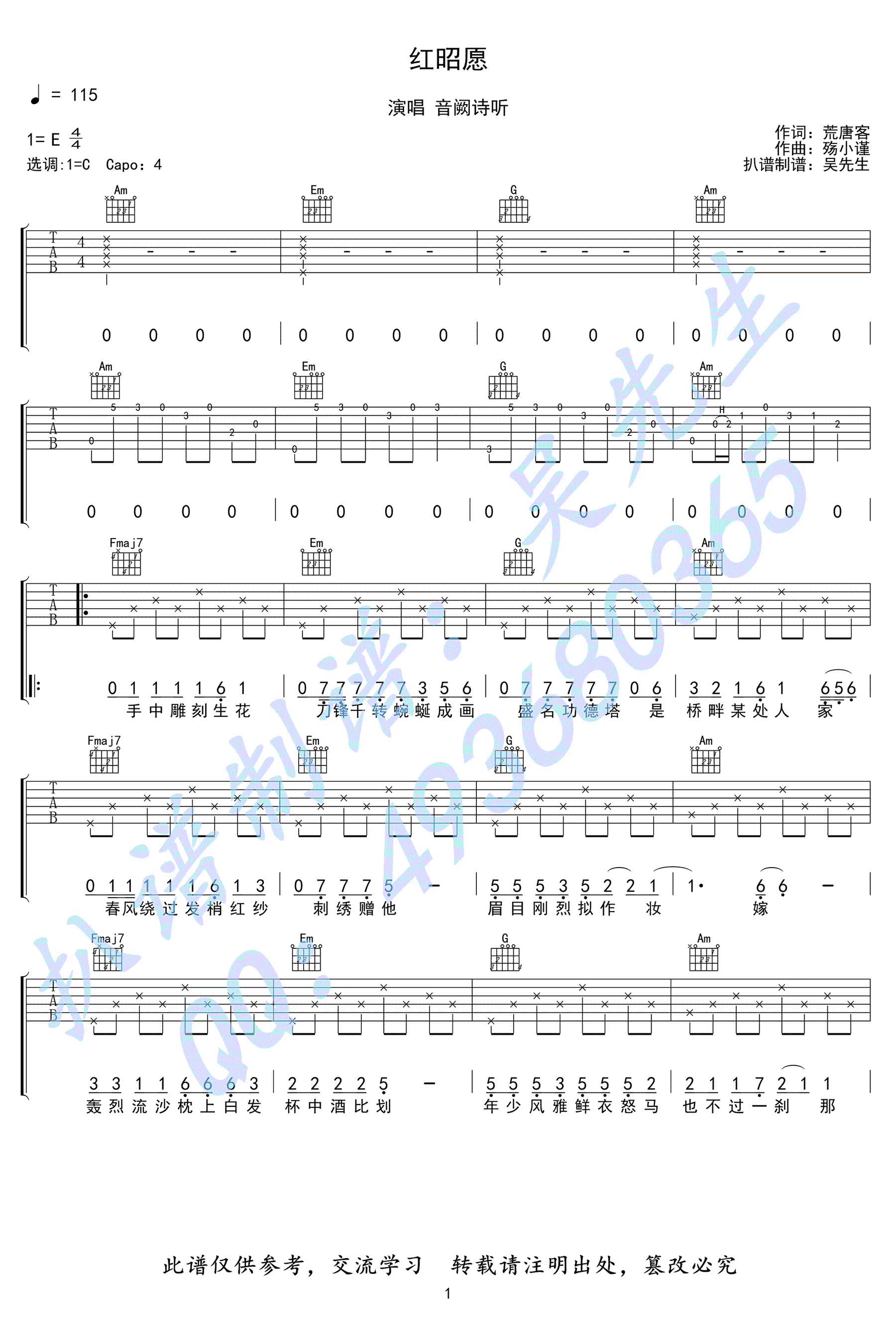 曲谱介绍: 音阙诗听《红昭愿》吉他谱,原调E,选调C,变调夹夹四品。红昭愿六线谱,吉他弹唱高清图片谱。感谢吴先生扒谱制作,91吉他谱推荐分享。 电音元素R&B与中国风的结合,创新碰撞出惊艳的听觉享受,充满意蕴的歌词以及动人的曲调,让人百听不厌。短短三分钟的时间以美妙的旋律讲述了人生的千回百转爱恨情仇。