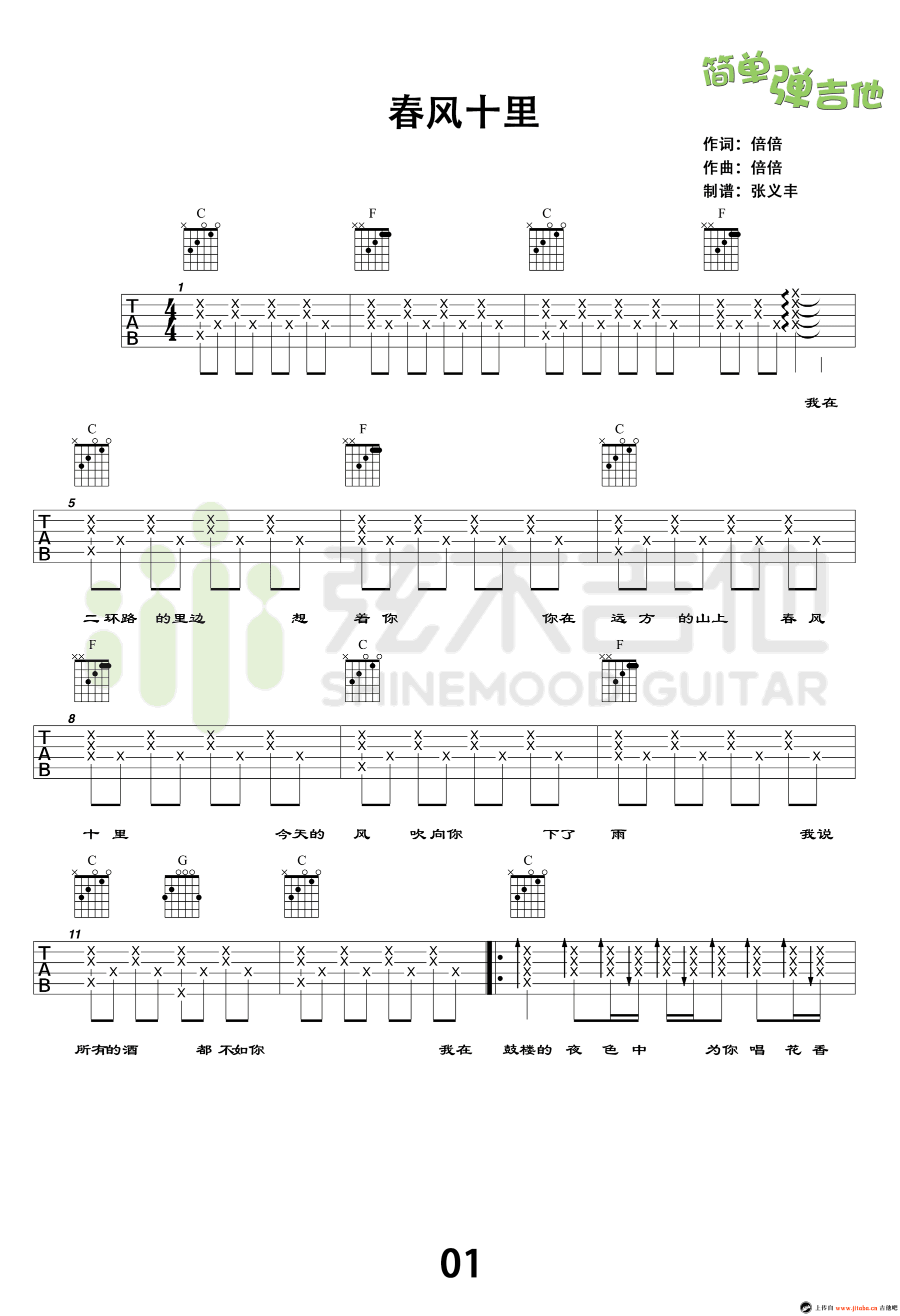 曲谱介绍: 春风十里吉他谱,C调简单版,鹿先森乐队的一首民谣歌曲,春风十里六线谱,图片谱高清版。男生使用变调夹夹四品,女生需要降全音调弦。歌曲中右手的扫弦节奏型大家可以单独练习熟练,再把演唱部分加入进去,感谢张义丰老师的编配和教学视频演示,拿起你的吉他,让我们一起学习吧。 喜欢听悠扬有故事的民谣、小调,它们纯粹的声音唱出了这个世界浮尘之外。鹿先森乐队带着一股清新的气息,即使在层层保围的钢筋水泥城市里生活,也渴望在山上眺望。