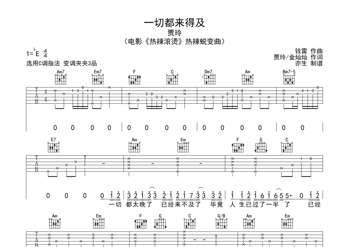 曲谱介绍: 贾玲《一切都来得及》吉他弹唱谱,采用C调指法编配,亦生编配出品,共有4张高清图谱。