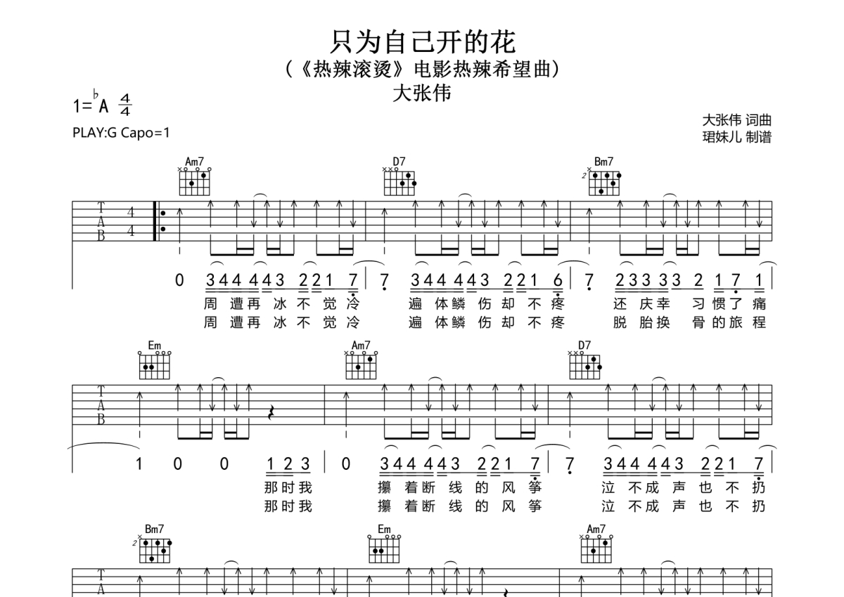 • 只为自己开的花吉他谱 - 大张伟 - G调吉他弹唱谱第1张