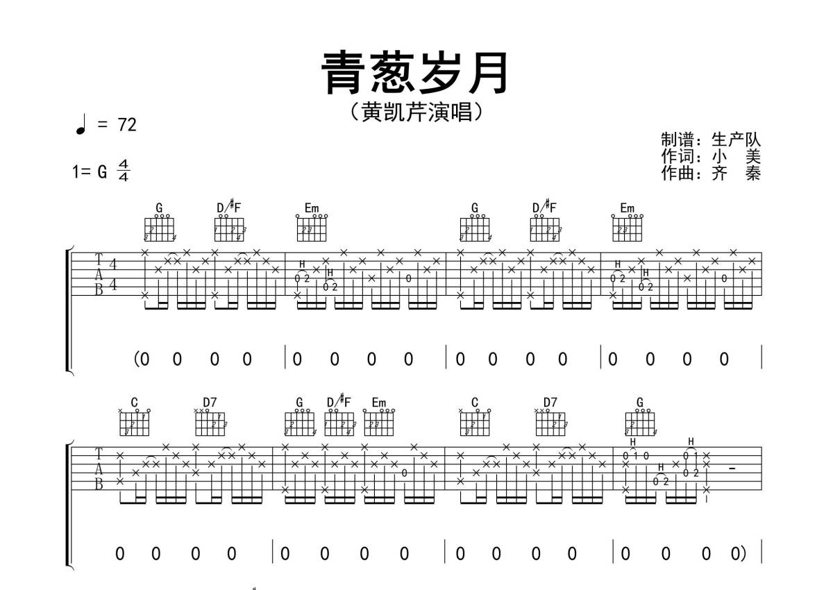 曲谱介绍: 黄凯芹《青葱岁月》吉他弹唱谱,采用G调指法编配精编完美版,生产队编配出品,共有3张高清图谱。