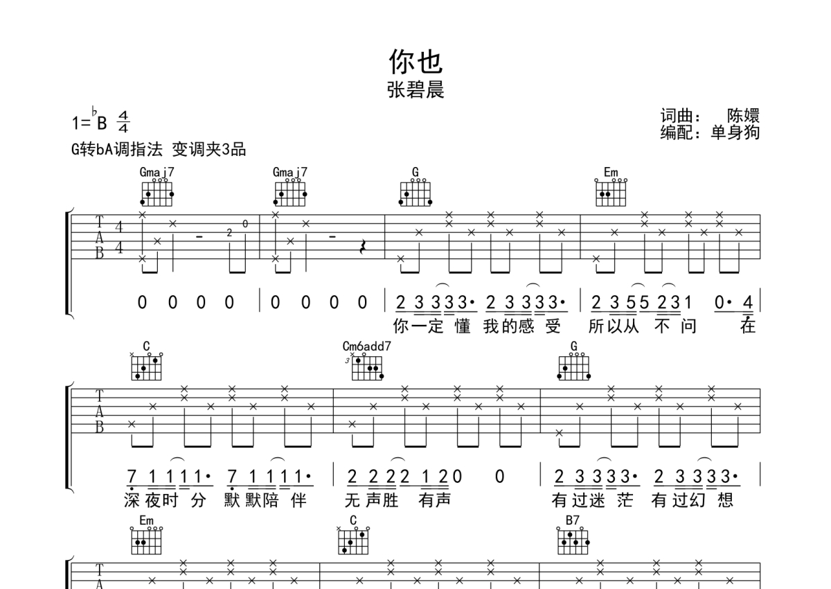 曲谱介绍: 张碧晨《你也》吉他弹唱谱,采用G调指法编配,单身狗编配出品,共有3张高清图谱。