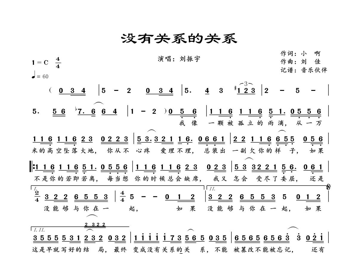 曲谱介绍: 刘振宇《没有关系的关系》,音乐伙伴编配出品,共有1张高清图谱,免翻页排版设计。